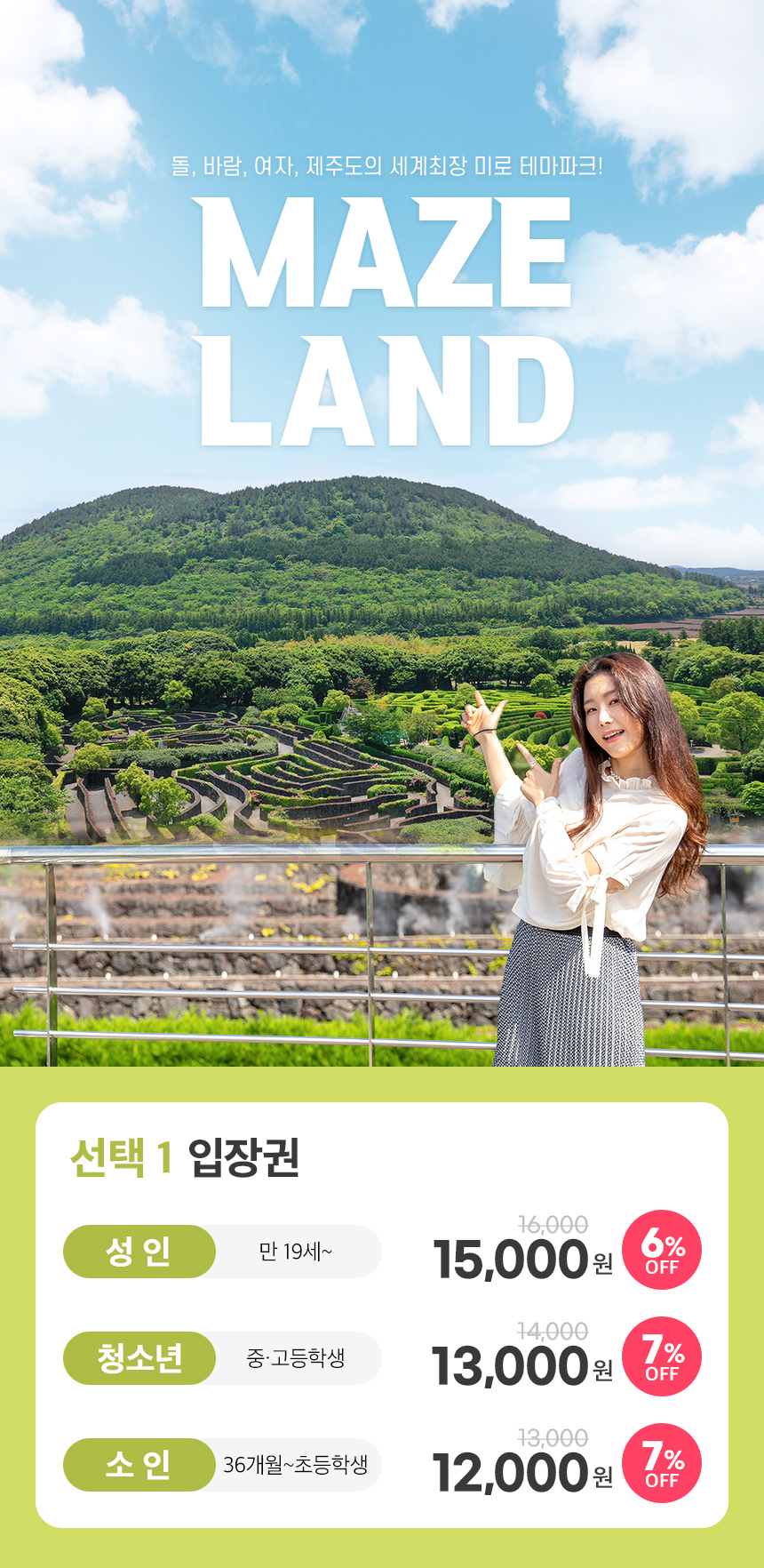 세계 최장 미로테마파크에서 메이즈러너가 되어보세요! 제주 메이즈랜드는 제주의 상징하는 삼다(돌, 바람, 여자)로 구성된 총길이 5km의 미로 테마파크예요. 돌미로는 세계 최장 석축미로로 제주 올레를 제현하고 돌하르방의 모습을 하고 있어요. 또한 바람미로는 태풍 모양을 한 측백나무, 여자 미로에서는 무려 2,922그루의 나무가 있어 상쾌한 공기를 만끽할 수 있어요.