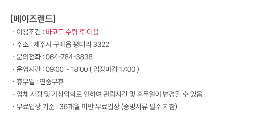 ※ 업체 사정 및 기상 악화로 인하여 관람시간 및 휴무일이 변경될 수 있습니다.