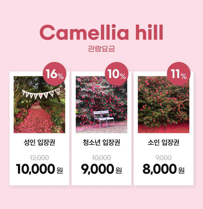 아름다운 꽃으로 가득한 카멜리아 힐에서 산책을 즐겨보세요. 사계절 내내 특별한 꽃들이 여러분을 기다리고 있어요. 카멜리아 힐은 20만 제곱미터 규모를 자랑하는 수목원으로 겨울의 동백꽃, 봄의 벚꽃 등 각 개화 시기에 맞는 다양한 꽃들을 만나는 재미가 있어요.