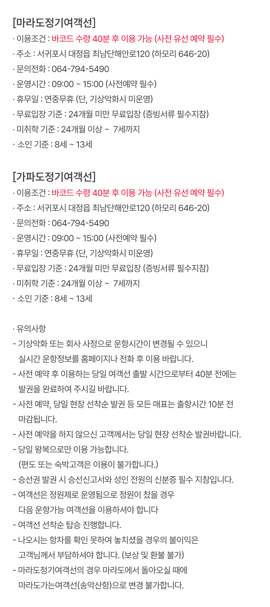 현지 사정에 의해 사전 고지 없이 운항시간이 변동될 수 있습니다. 유선을 통해 운항 여부를 확인해주세요.