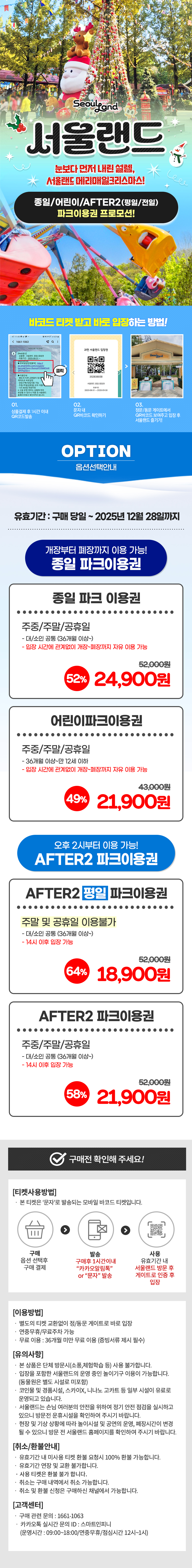 한국어 제공🎡 서울랜드, 단기간 특가 오픈! 계절마다 달라지는 테마와 밤까지 이어지는 축제 분위기 속에서 하루 종일 즐기는 짜릿한 놀이시간을 가장 특별한 가격으로 만나보세요! ✨ 판매기간 : 2025.11.24 ~ 2025.11.29 유효기간 : 구매일 ~ 2025.12.28
