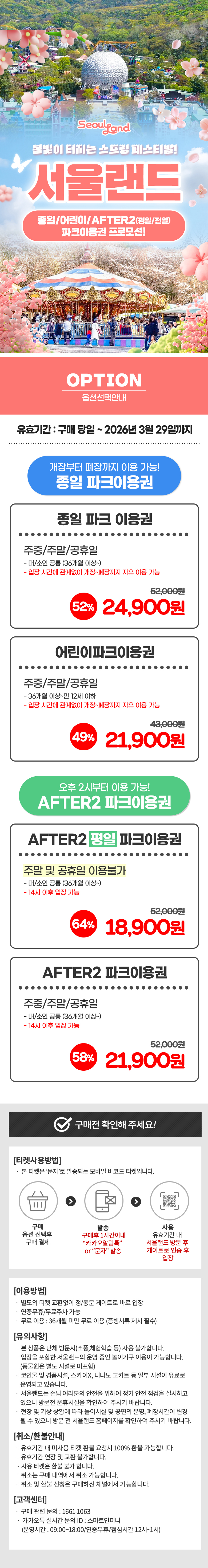 한국어 제공🎡 서울랜드, 단기간 특가 오픈! 계절마다 달라지는 테마와 밤까지 이어지는 축제 분위기 속에서 하루 종일 즐기는 짜릿한 놀이시간을 가장 특별한 가격으로 만나보세요! ✨ 판매기간 : 2026.02.23 ~ 2026.02.27 유효기간 : 구매일 ~ 2026.03.29