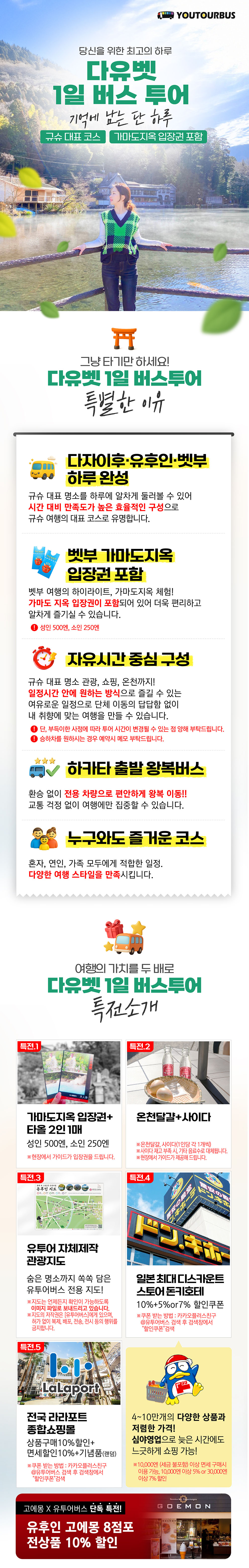 한국어 제공"❤️유투어버스 단독 특전이벤트! 유투어버스를 이용하는 고객님 한정 유후인 인기 과자공방 고에몽 전상품 10%할인 특전을 드립니다! ❤️ 11월부터 2월은 일몰 시간이 빨라지기 때문에 기존 8시 20분 출발에서 8시 출발로 변경됩니다. ""연말연시 및 성인의 날에도 정상적으로 운행됩니다 *다자이후 관광지 제외"