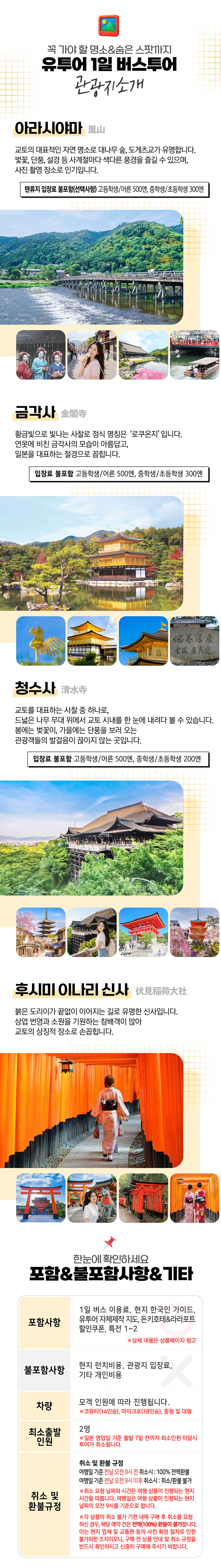 오사카에서 출발하여 일본 교토를 대표하는 여행지를 버스투어로 편하게 만나보세요. 금각사, 아라시야마, 청수사, 후시미 이나리신사까지 교토 여행지를 편하게 방문하고 마음껏 예쁜 사진을 찍고 즐길 수 있어요.