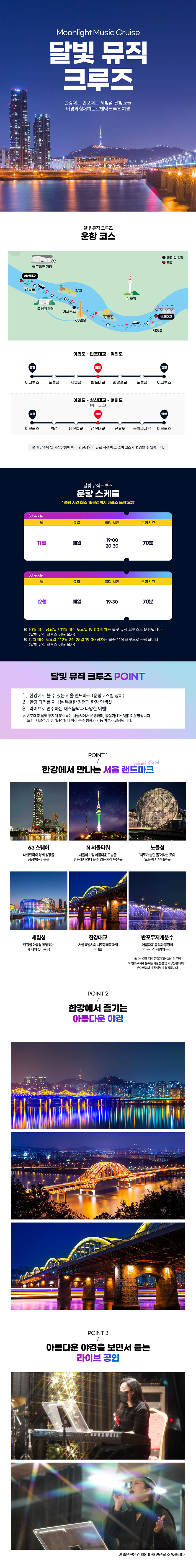 달빛뮤직크루즈에서는 잔잔한 재즈 선율과 함께 한강의 다리를 통과하는 흔치 않은 경험, 그리고 물 위에 비친 도시의 불빛을 배경으로 인생샷을 남길 수 있고, 🎆 불꽃뮤직크루즈에서는 눈앞에서 터지는 화려한 불꽃과 반짝이는 스카이라인이 어우러진 순간이 매주 단 한 번만 허락되는 특별한 추억으로 남아요.