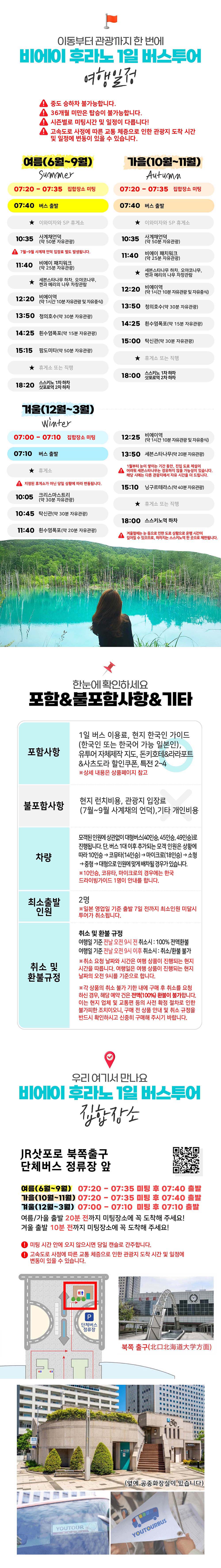 홋카이도 필수 여행지 비에이와 후라노를 1일 버스투어로 편하게 다녀오세요! 해당 투어는 유투어버스에서 진행하는 투어로 '오직 한국인만' 탑승해 투어를 즐길 수 있는 프로그램이에요. 편안한 버스를 타고, 꼭 가봐야 할 명소! 흰수염 폭포, 신비로운 청의 호수, 사계채언덕과 같은 필수 여행지를 만나보세요.