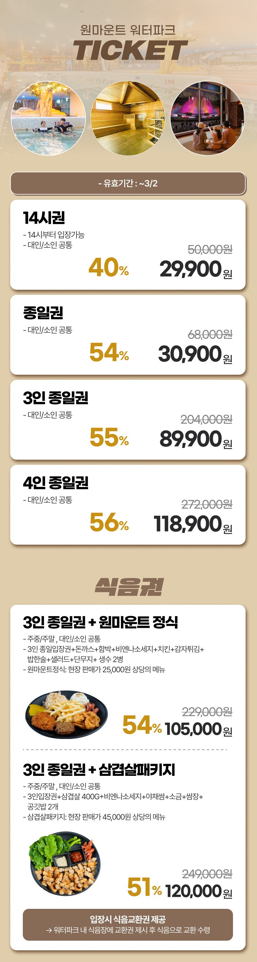 서울에서 단 30분 거리, 일산에 위치한 원마운트 워터파크를 만나보세요! 워터파크 필수 코스, 파도풀을 비롯하여 유수풀, 바데풀 등 다양한 시설과 아이들이 놀기 좋은 유아풀과 키즈존뿐만 아니라 스릴 있는 바디슬라이드와 투겔라이드 등 어트랙션도 짜릿하게 즐길 수 있어요. 지금 바로 원마운트 워터파크에 방문해 보세요.