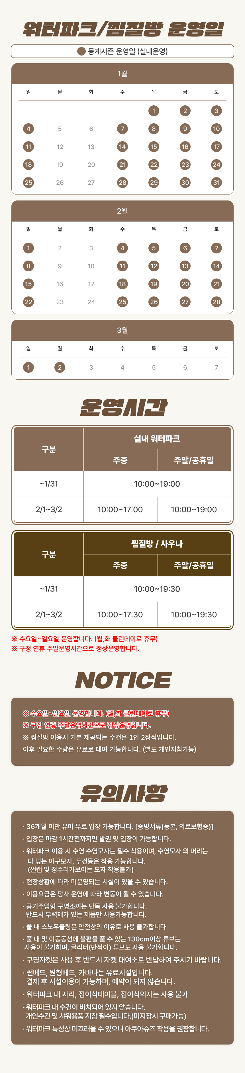 *운영 정보는 현장 상황에 따라 변동될 수 있습니다. 월별/시설별 자세한 운영시간은 상세정보 및 홈페이지 참고 바랍니다.