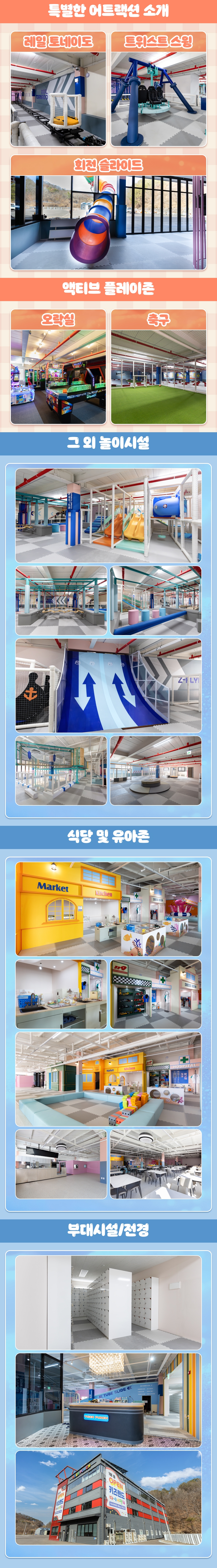 1층부터 4층까지 전 층이 놀이 공간으로 구성되어 있어 층마다 다른 테마와 어트랙션을 즐길 수 있는 것이 가장 큰 매력이에요. 레이싱존에서는 직접 차량을 타고 달리는 짜릿한 체험을, 대형 볼풀존과 튜브 슬라이드에서는 몸을 던져 신나게 놀 수 있는 활동적인 놀이가 펼쳐져요. 트램플린, 트위스트 스윙 등 아이들이 특히 좋아하는 인기 어트랙션들도 가득해 시간 가는 줄 모르고 즐기게 됩니다. 연령대별로 구분된 키즈 맞춤 공간과 유아존도 잘 마련되어 있어 어린 아이부터 활동적인 초등 저학년까지 모두 안전하게 이용할 수 있어요. 보호자를 위한 휴식 공간은 물론, 오락실과 식당 등 부대시설도 함께 갖춰져 있어 아이는 신나게 놀고, 부모는 여유롭게 쉴 수 있는 환경이 완성돼 있어요.