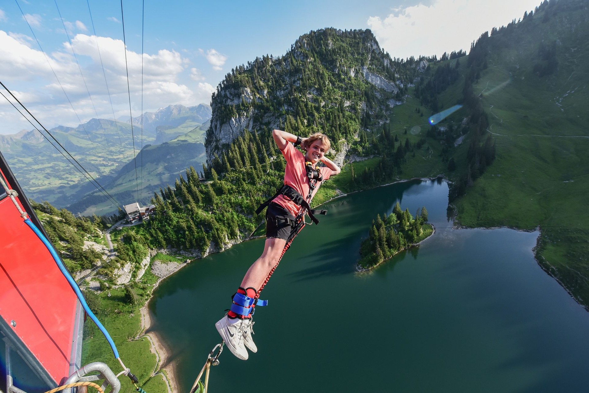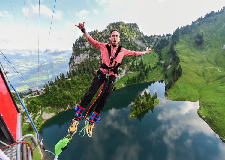 알프스산맥에서 번지점프를 할 때, 여유가 있다면 뛰면서 사진작가를 향해 웃는 것, 잊지 마세요! 여러분께서 스톡호른 호수 위로 뛰어내리실 때, 사진작가가 곤돌라 옆에서 멋진 번지 점프의 순간을 촬영하고 있어요. 과감한 점프를 하며 사진작가를 향해 웃어주시면, 세상 어디에서도 구할 수 없는 특별한 사진을 남길 수 있을 거예요! 더욱 눈에 띄는 멋진 사진을 남기고 싶다면, 밝은 색상의 옷을 입어보세요. 밝은 색상의 옷이 여러분을 사진과 비디오에서 훨씬 돋보이게 만들어 드려요.