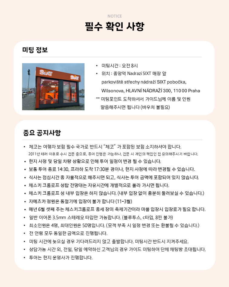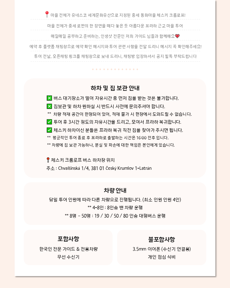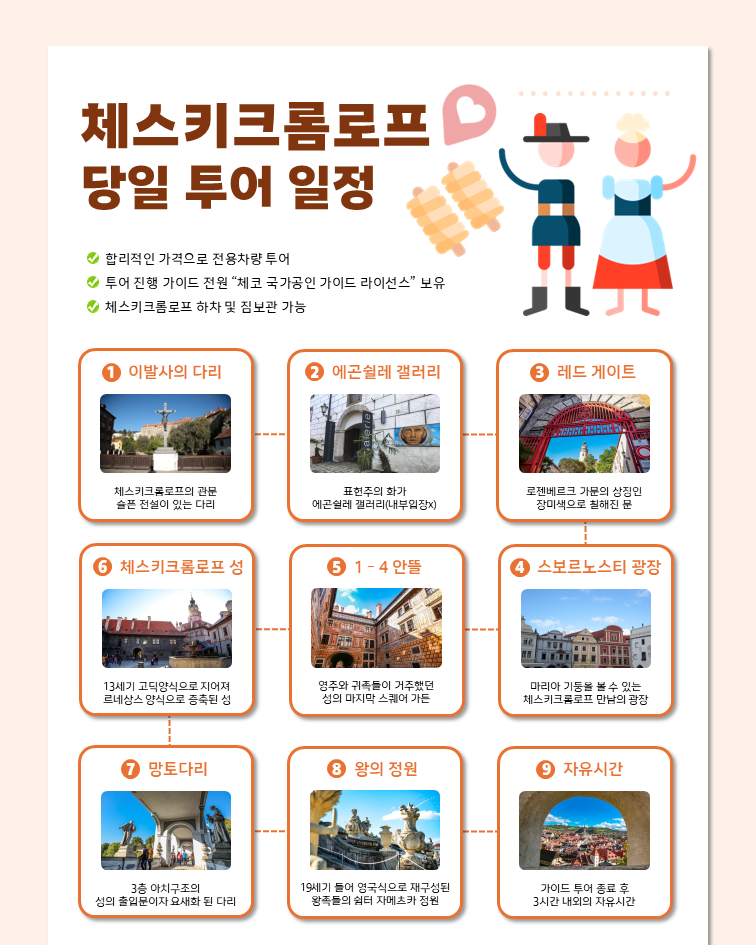 프라하에서 출발해 하루는 체코의 아름다운 동화 속 마을 체스키 크룸로프에 방문해보세요. 해당 투어는 버스나 기차로 이동하기엔 피곤한 분들을 위해 전용차량으로 가이드와 함께 하는 투어를 준비했어요. 이제 모두 편하게 투어 차량을 타고 전문 가이드와 함께 편하게 유럽의 중세마을로 시간 여행을 떠날 수 있어요. 크룸로프에서 왕의 정원, 라트란 거리 그리고 루제호텔과 빨간 지붕 뷰 포인트까지 예쁜 여행지를 모두 만날 수 있어요!