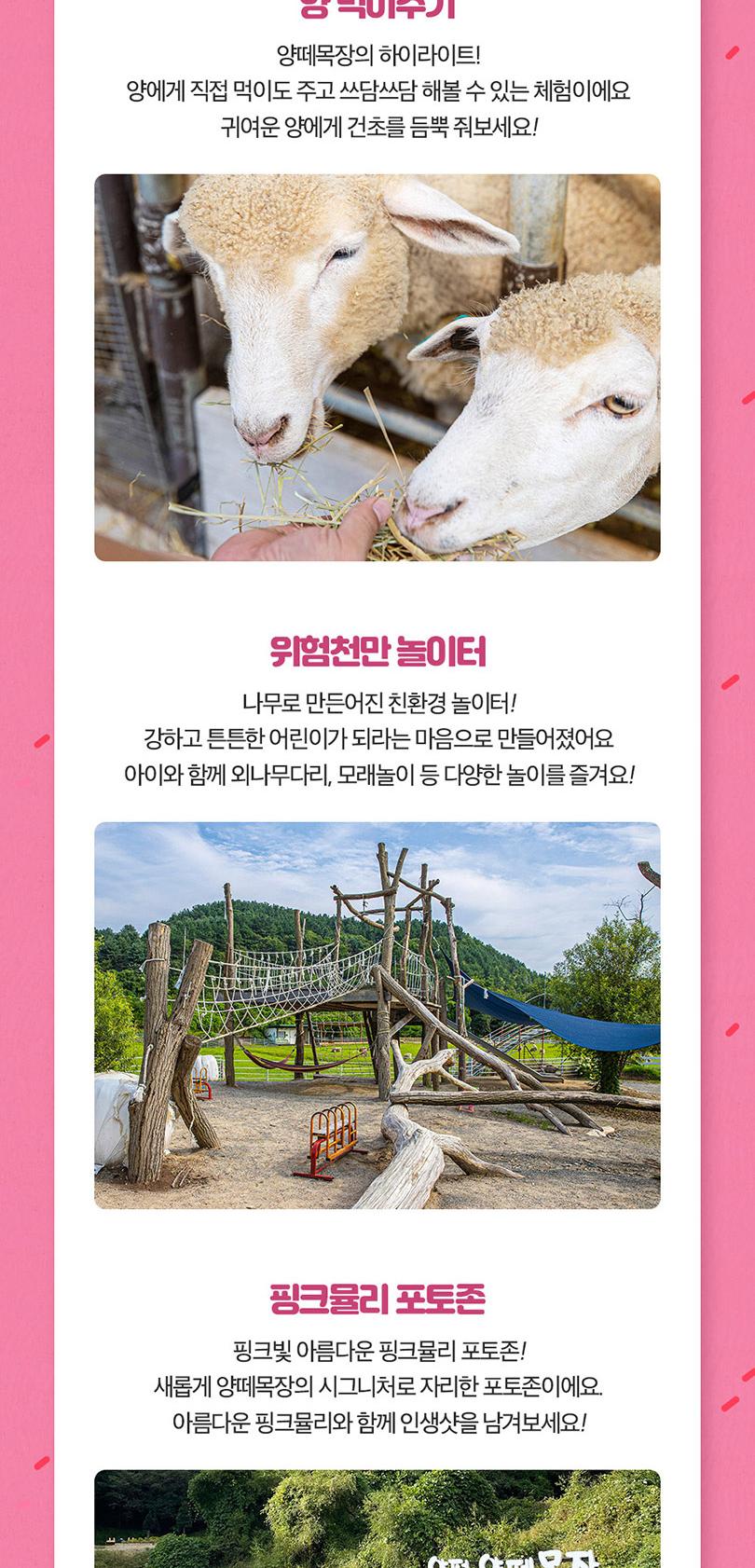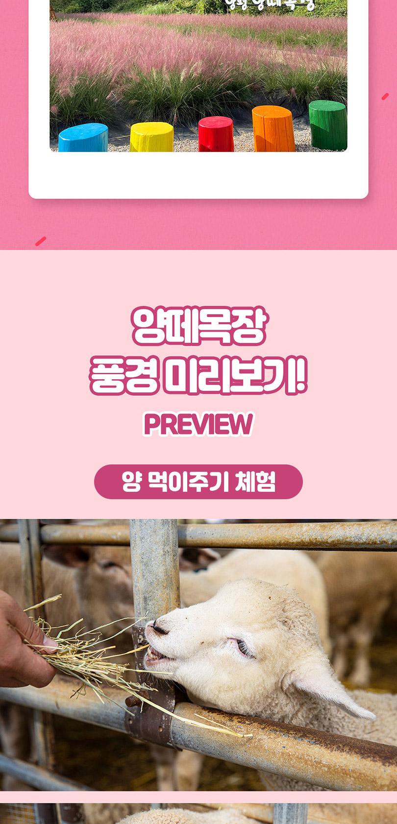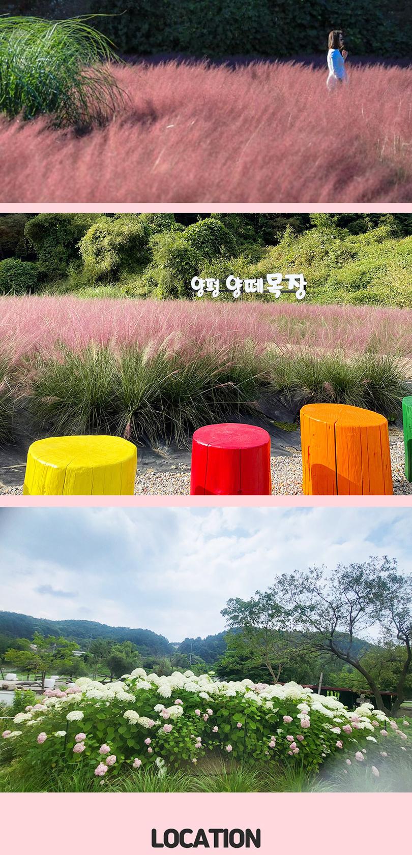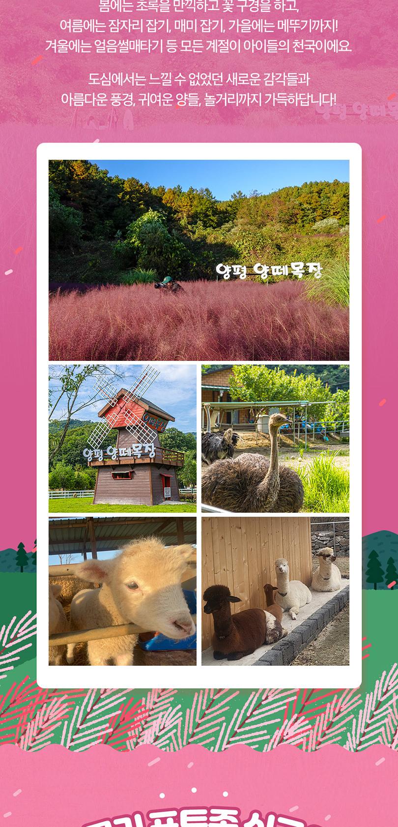 서울 근교 나들이 명소, 양평 양떼목장입니다. 드넓은 초원에서 자연의 아름다움을 느끼며 다양한 동물들을 만나 교감할 수 있습니다. 봄에는 봄꽃, 여름에는 수국, 가을에는 핑크뮬리, 겨울에는 얼음썰매까지! 양평 양떼목장으로 놀러 오셔서 소중한 추억을 만들어보세요.