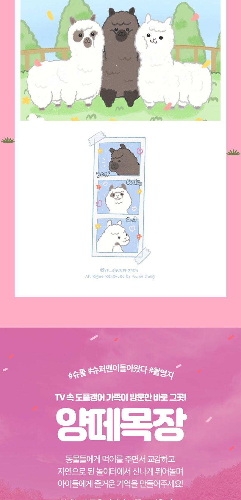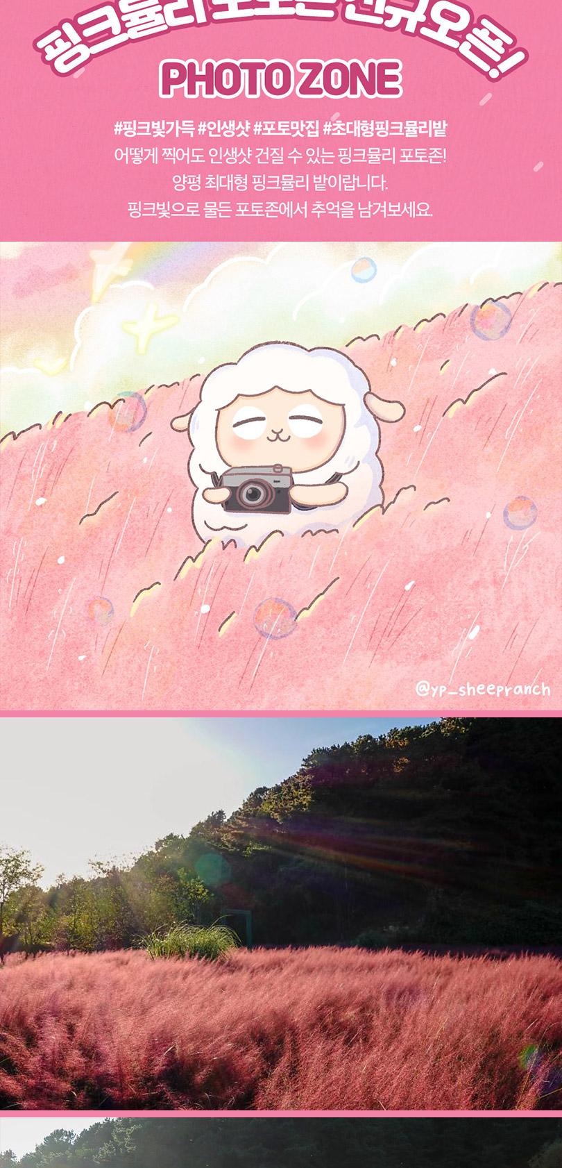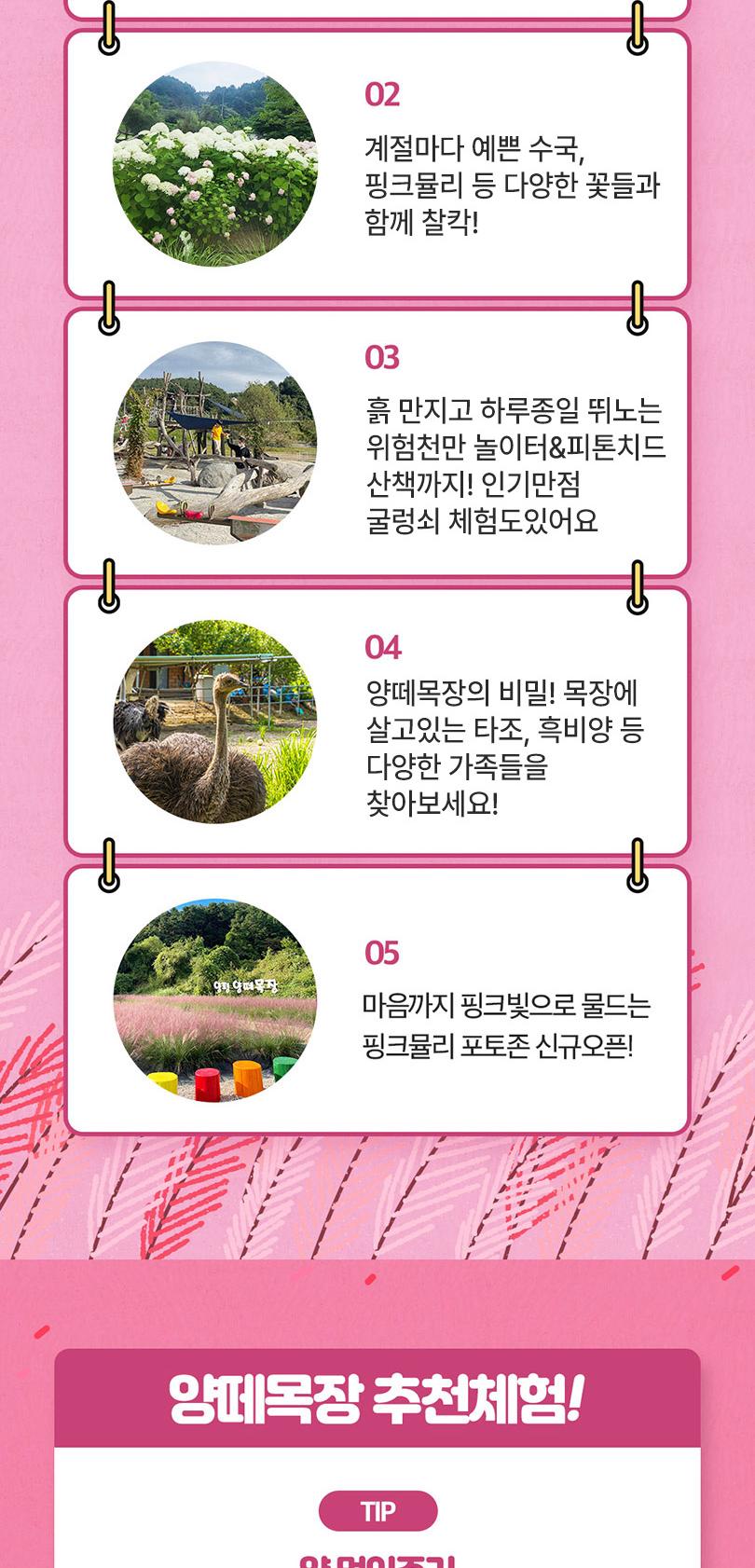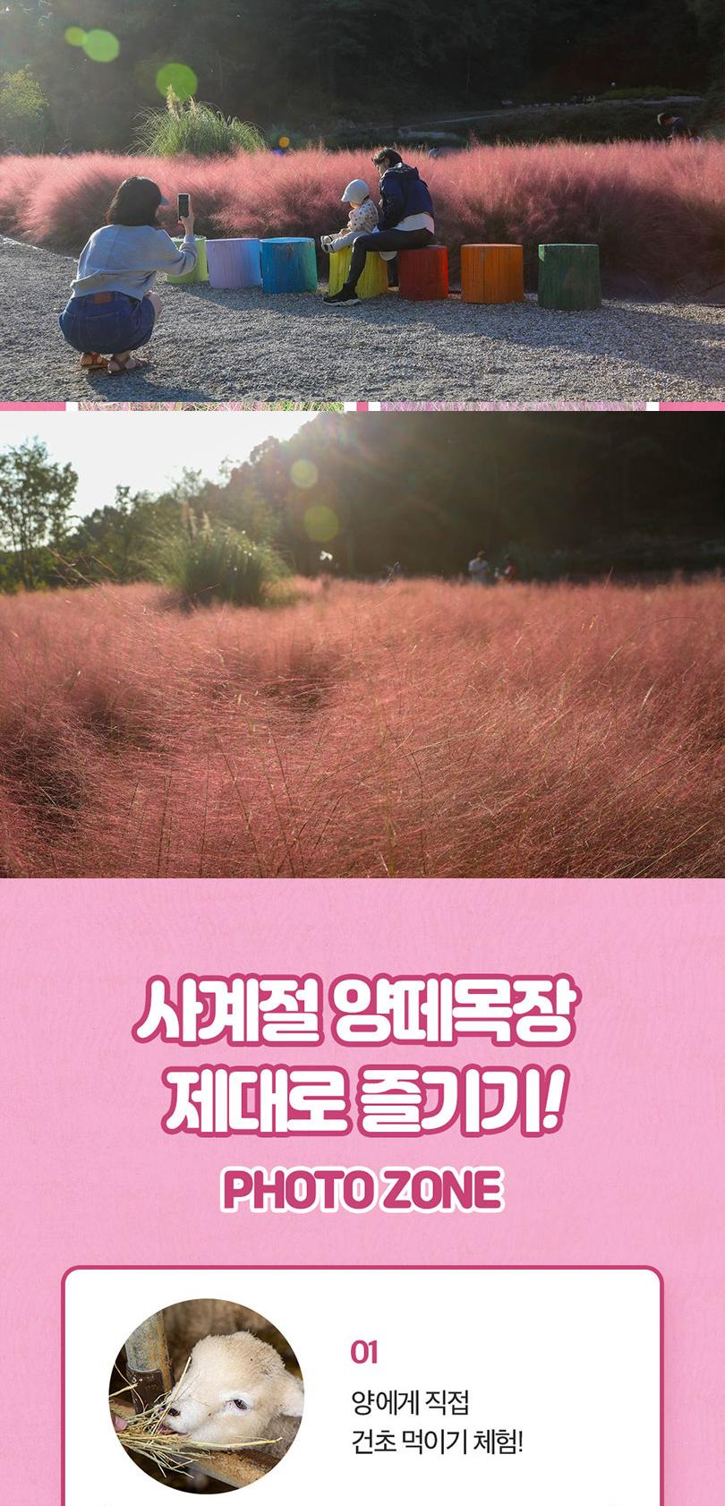 서울 근교 나들이 명소, 양평 양떼목장입니다. 드넓은 초원에서 자연의 아름다움을 느끼며 다양한 동물들을 만나 교감할 수 있습니다. 봄에는 봄꽃, 여름에는 수국, 가을에는 핑크뮬리, 겨울에는 얼음썰매까지! 양평 양떼목장으로 놀러 오셔서 소중한 추억을 만들어보세요.