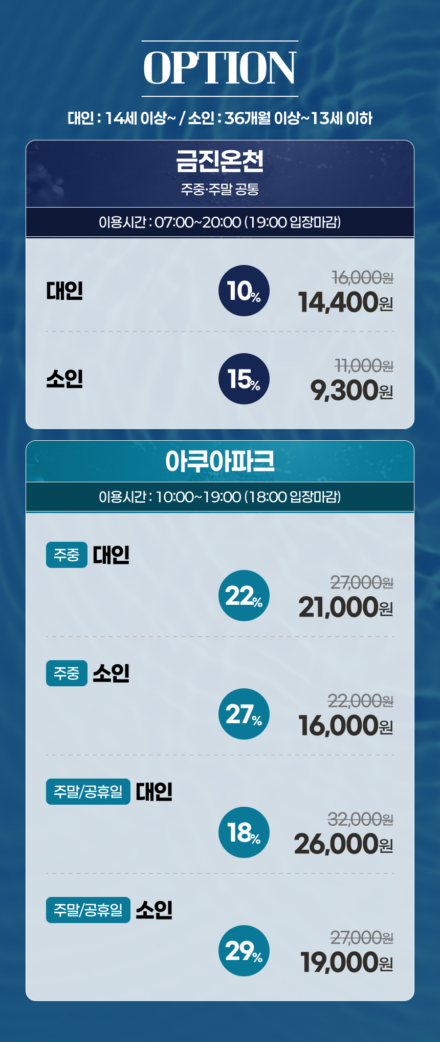 금진온천은 천연 온천수로 구성된 실내·노천탕과 사우나 시설을 갖추고 있어 하루의 피로를 편안하게 풀어주고, 아쿠아파크는 다양한 풀과 워터존으로 어른과 아이 모두 부담 없이 즐길 수 있는 구성이에요. 주중과 주말 모두 이용 가능해 일정에 맞춰 활용하기 좋아요. 🌊🛟하루는 느긋하게, 하루는 활기차게 보내고 싶은 분들께 잘 어울리는 구성으로 가족·커플·친구 여행 모두에 만족도를 더해줘요. ✨