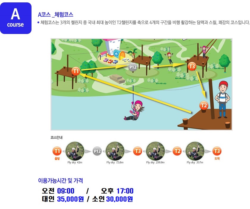 A코스는 비교적 부담 없는 난이도로 구성된 체험형 코스로, 짚트랙을 처음 접하는 분들에게 잘 어울려요. 국내 최대 높이의 T2 챌린지를 중심으로 총 4개의 구간을 비행하며, 단계적으로 높이와 거리를 경험할 수 있어요.