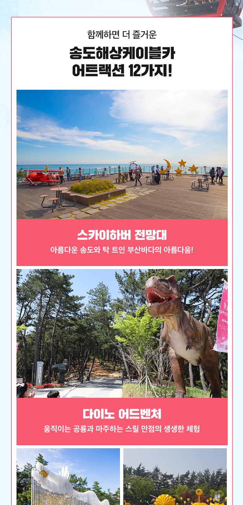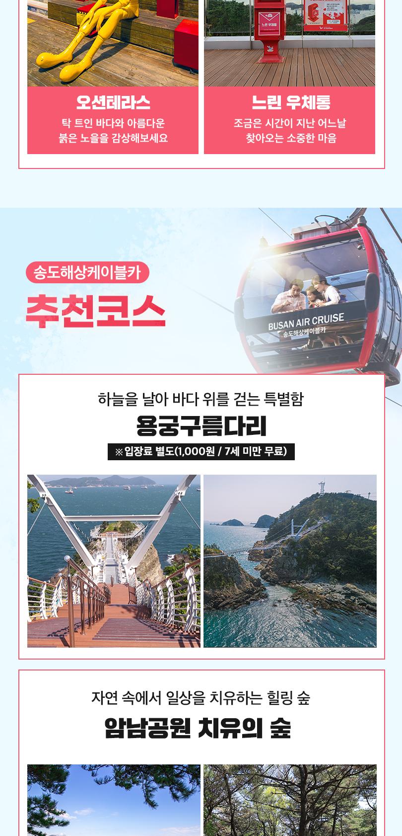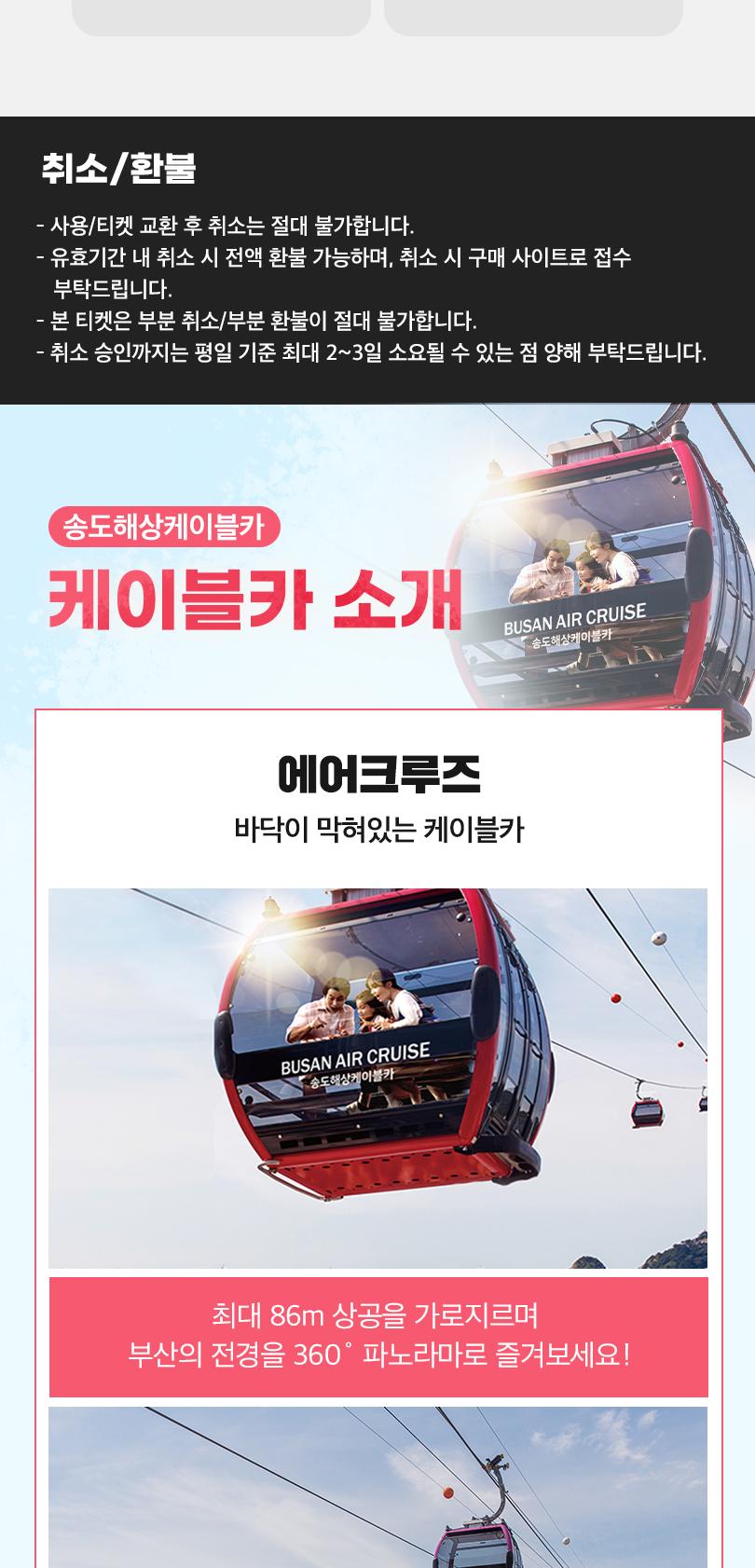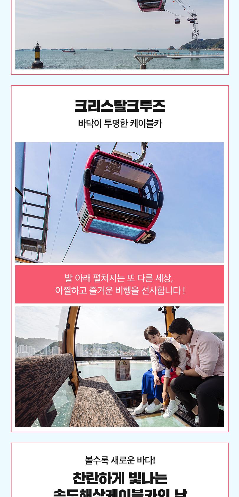 부산 송도해수욕장에 위치한 송도해상케이블카는 송도해수욕장 동쪽 송림공원에서 서쪽 암남공원까지 1.62km 바다 위를 가로질러 운행해요. 최고 86m 높이의 바다 한가운데에서 하늘을 날으는 짜릿함과 동시에 송도해수욕장, 부산 영도와 남항대교, 송도용궁구름다리, 파도치는 기암 절벽까지 한 눈에 감상할 수 있어요. 케이블카, 그 이상의 즐거움! 송도해상케이블카에서 만나보세요.