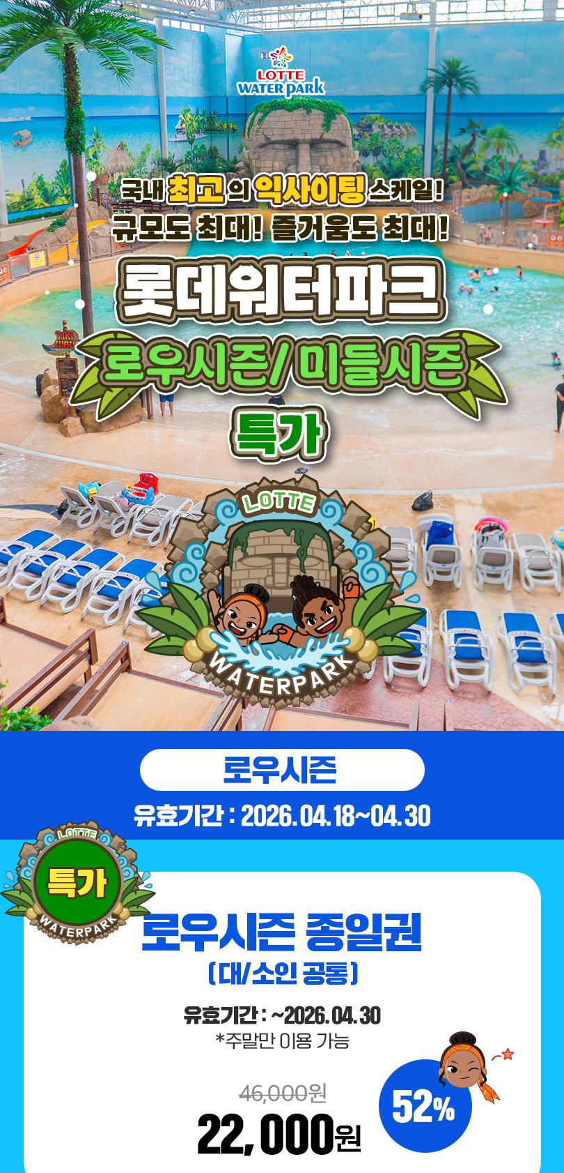 한국어 제공국내 최대급 스케일, 짜릿함이 다른 워터파크 🌊 김해 롯데워터파크 특가 오픈🔥 지금 가장 핫할 때 만나보세요! 판매기간 : 2026.04.22 ~ 2026.04.26 유효기간 : 시즌별 상이 * 로우시즌 : ~ 2026.04.30 * 미들시즌 : 2026.05.01 ~ 2026.05.22