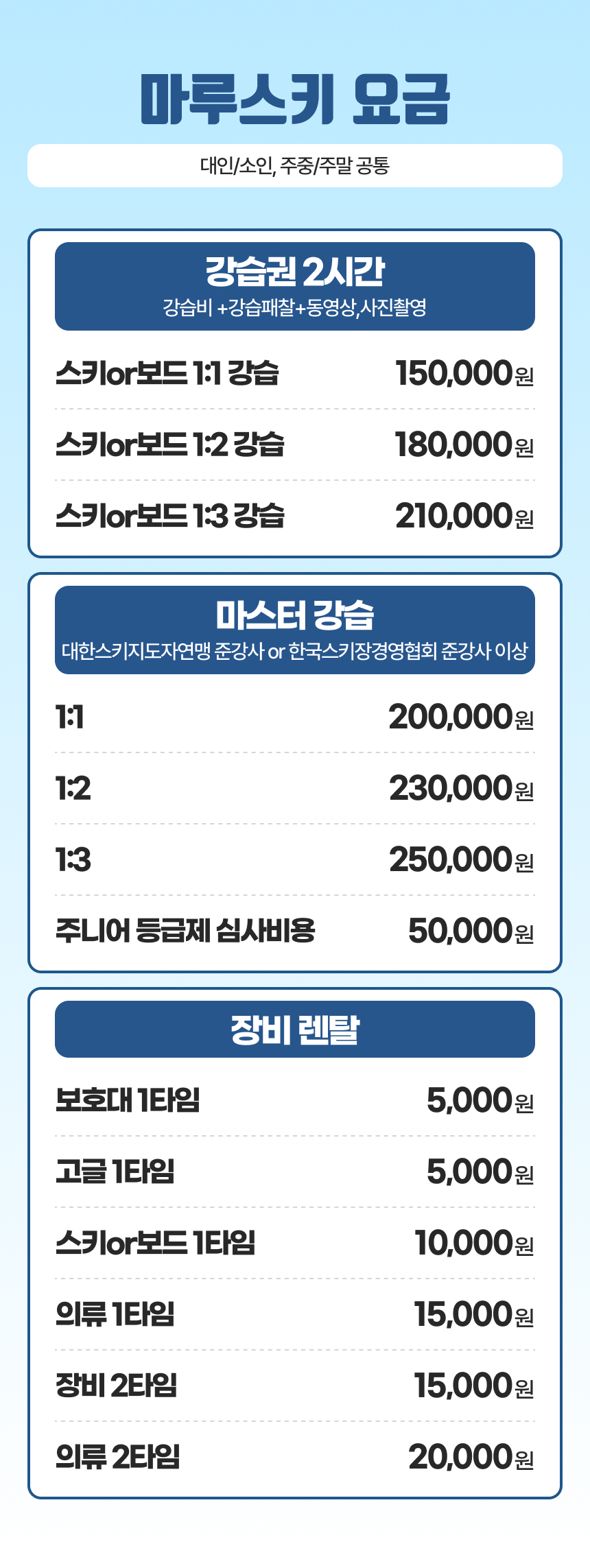 강습은 단계별로 세분화되어 있어요. 스키를 처음 신어보는 기초반부터, 속도를 즐기기 시작한 초급반, 자신감을 얻어 슬로프를 넓게 즐기는 중급반, 시합반과 자격증 대비반까지! 누구나 자신의 실력과 목표에 맞게 선택할 수 있어, 처음 와도 자연스럽게 레벨업되는 과정이 매력적이에요. 강습의 핵심은 대한스키지도자연맹 소속 강사진이라는 점입니다. 믿을 수 있는 지도자들과 함께라면 안전과 실력, 두 가지를 모두 채울 수 있어요! 무엇보다 강습 컴플레인 시 100% 환불 정책은 확실한 자신감을 보여줍니다. 퀄리티에 대한 자부심이 없으면 말하기 어려운 조건이죠. 여기에 주 1회 서비스 마인드 수강, 리프트·렌탈·숙박 제휴 혜택까지 더해져 전체 경험이 더 풍부해집니다.