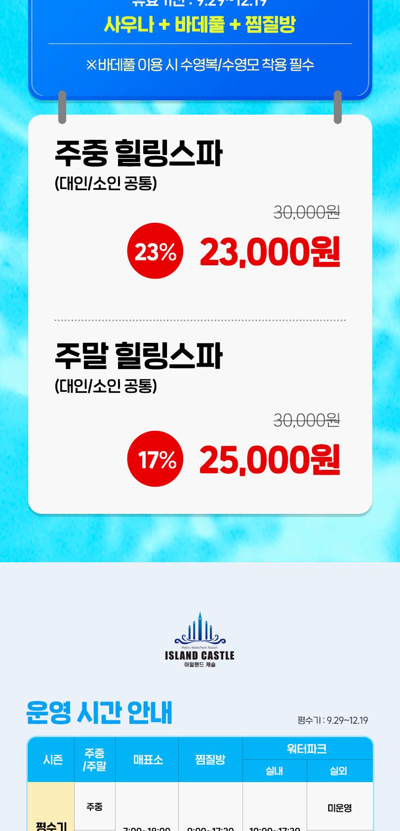 아일랜드캐슬 워터파크에서는 실내와 실외를 넘나들며 다채로운 물놀이 시설을 즐길 수 있어요. 스릴 넘치는 파도풀에서 시원한 파도를 느끼고, 유유히 흐르는 유수풀에서 몸을 맡겨 보세요. 실내 워터파크, 실내 바데풀, 찜질방까지 있어 날씨 걱정 없이 사계절 내내 즐겁게 즐길 수 있어요. 아이들의 모험심을 자극하는 아쿠아 플레이는 물론, 실외에는 110m 길이의 짜릿한 스피드 슬라이드 등 다양한 슬라이드 시설들이 가득해요. 물놀이로 지친 몸은 따뜻한 스파에서 편안하게 녹여보세요.