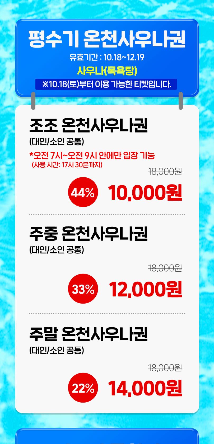 ※온천사우나 권종 티켓은 오전7시에서 오전 9시에만 입장 가능한 티켓입니다 (사용 가능 시간 : 17시 30분까지)
