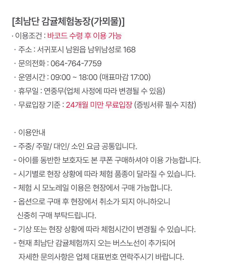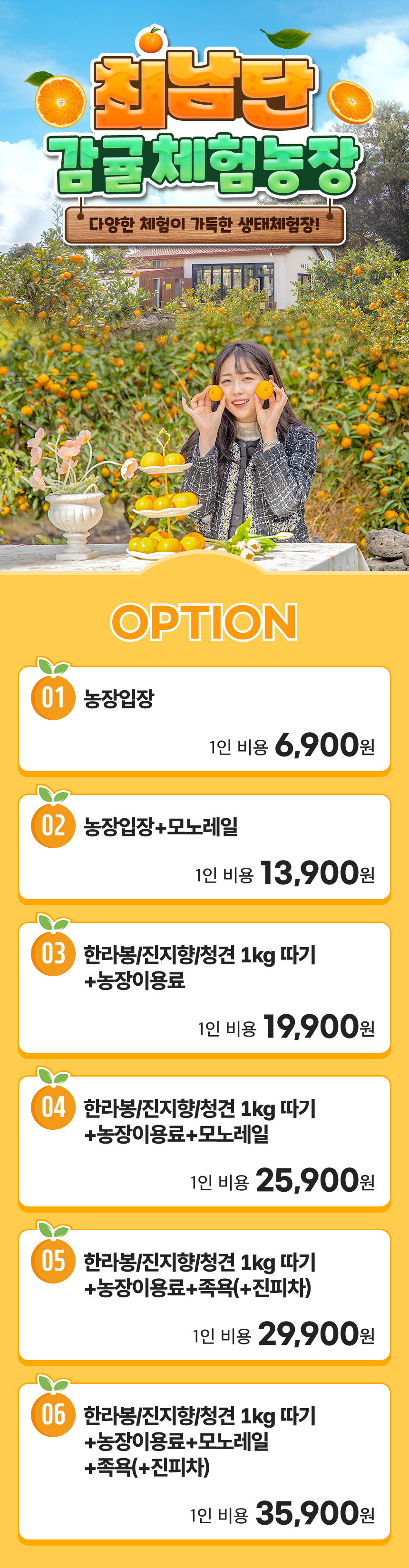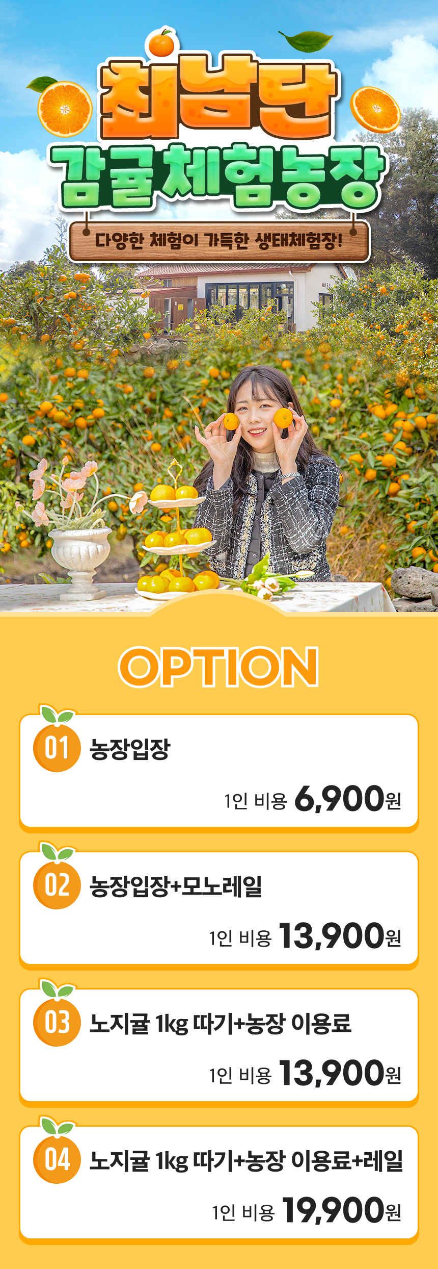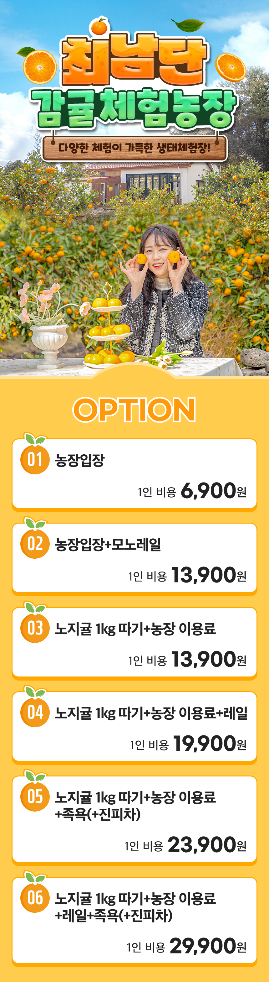 제주 최남단체험감귤농장에서는 다양한 품종을 재배해 연중 언제나 한라봉과 감귤, 천혜향, 블루베리를 비롯한 수확 체험을 즐길 수 있어요. 또, 감귤나무 주위로 제주에서만 만나볼 수 있는 자생 나비와 곤충, 식물을 만나고 토끼와 꽃사슴부터 기러기, 닭과 흑돼지까지 먹이 주기 체험으로 자연과 다방면으로 교감하는 시간을 가질 수 있어요. 감귤 농장을 통과하는 모노레일도 빼놓을 수 없는 프로그램이에요.