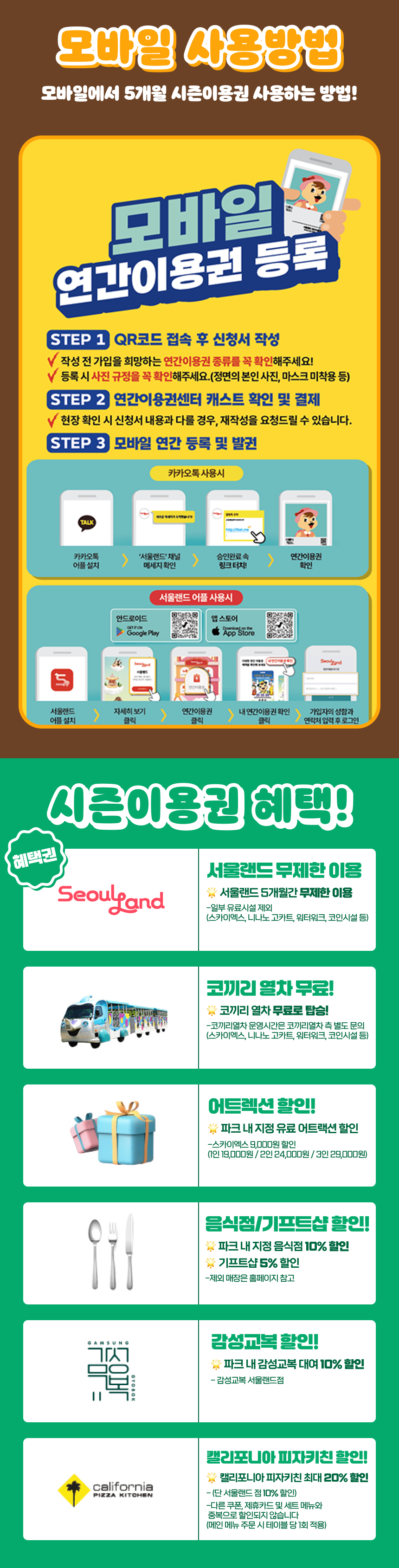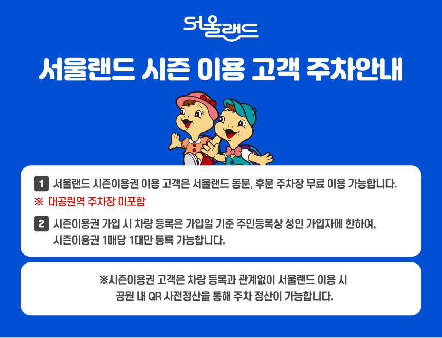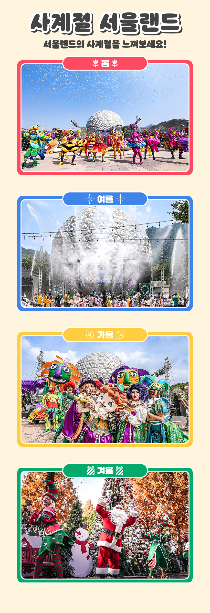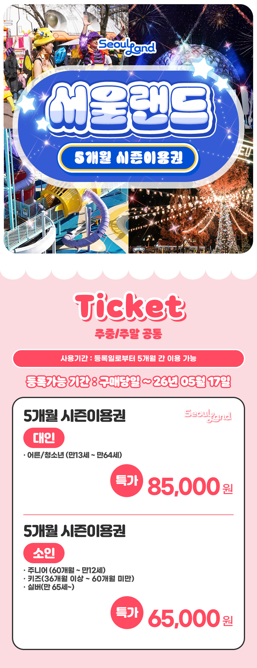 한국어 제공❣️서울랜드 5개월 시즌 이용권 특가! 합리적인 금액으로 구매하세요! 선착순 특가로 조기 마감될 수 있으니 서둘러 구매하시길 추천해요! ❣️ - 판매 기간 : 2026.04.20 ~ 2026.04.22 - 유효기간(정보등록기간) : 구매 당일 ~ 2026.05.17