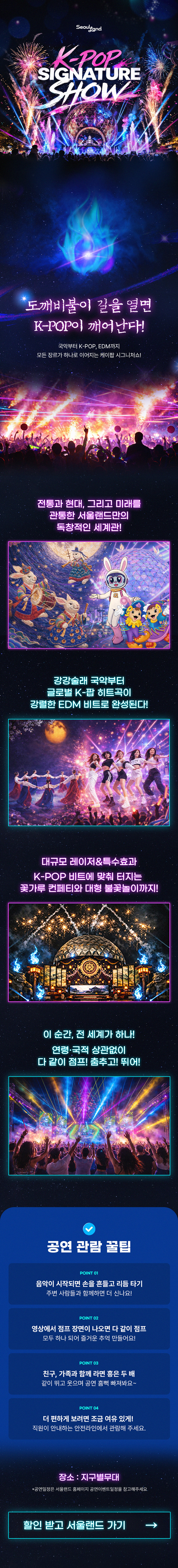 야간에도 다채로운 서울랜드! 반짝이는 빛과 음악으로 물들며 아름다운 야간공원으로 재탄생해요. 형형색색 LED 장미가 정원 곳곳을 비춰 로맨틱한 분위기를 나타내고 서울랜드가 전체가 화려한 조명으로 흠뻑! 가족 및 연인과 함께 평생 잊지 못할 추억을 남겨보세요.