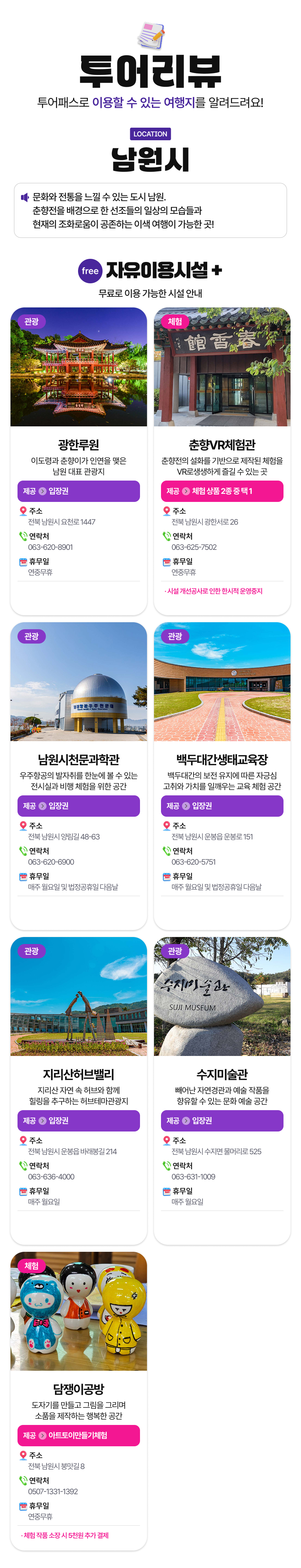 한 장의 카드로 24시간 동안, 남원 자유이용시설이 가능해요. 티켓 1장에 관광지 8군데 이용 가능 혜택은 물론 견우와 직녀의 전설이 담긴 오작교의 배경지인 광한루원과 볼거리와 체험이 가득한 춘향전 테마파크 춘향테마파크도 무료 입장 가능해요.
