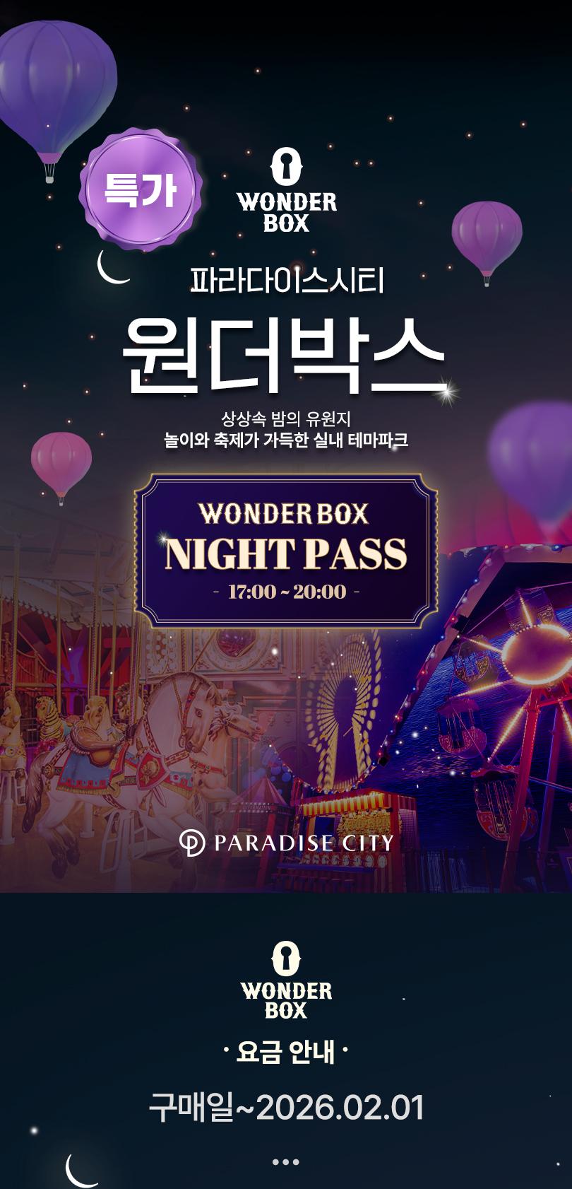 파라다이스시티 원더박스 나이트패스와 함께 화려한 조명 아래 펼쳐지는 축제의 밤을 만끽하고, 다양한 볼거리와 즐길 거리로 가득 찬 특별한 추억을 가득 담아 가세요! 💗