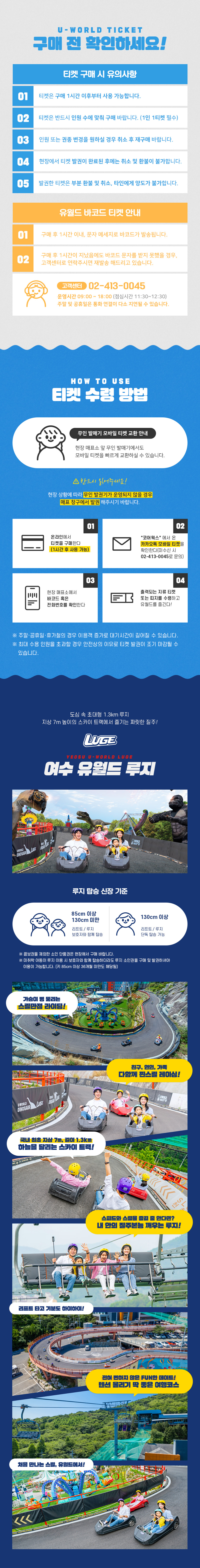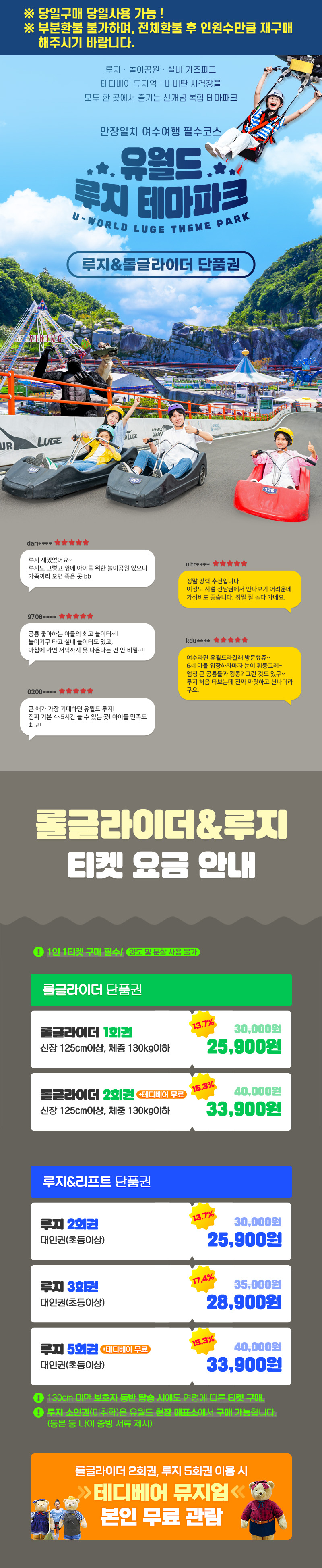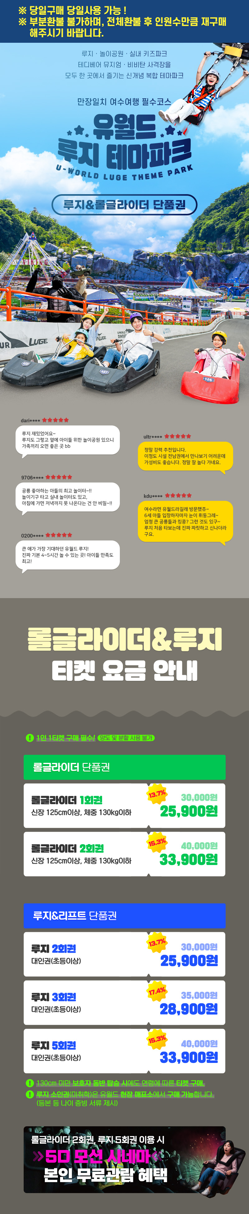 최소 3번은 타야 한다는 여수 루지! 단품권으로 2회, 3회, 5회 중 선택해 자유롭게 이용해보세요. 또한 루지 뿐만 아니라 테마파크 전체를 감싸며 날아가는 짜릿한 플라잉코스인 롤 글라이더도 함께 이용해보세요. 자유롭게 선택해 여수 루지 테마파크를 즐겨보세요!