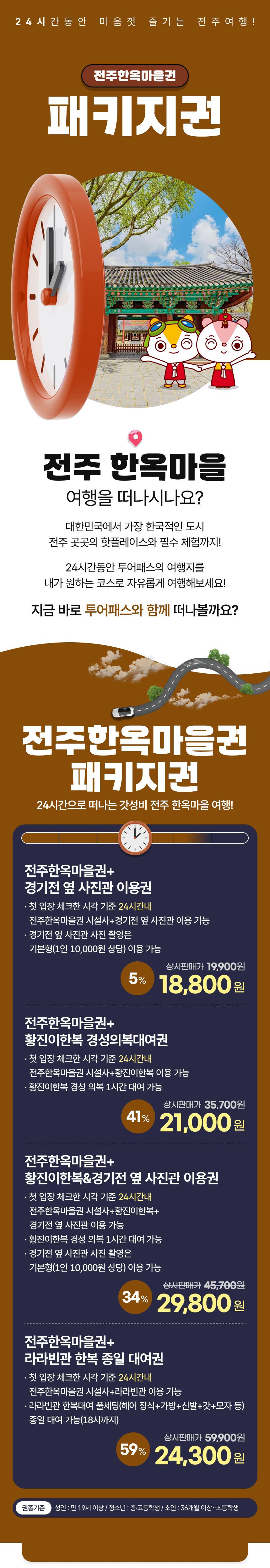 한국어 제공한 장의 카드로 전주한옥마을 완전 정복! 24시간 동안, 전주와 전주한옥마을의 인기 여행지를 무료로 입장할 수 있어요. 모바일 티켓으로 전주 한옥마을 내 관광지 7곳과 한복대여, 경성의복대여, 사진촬영까지!