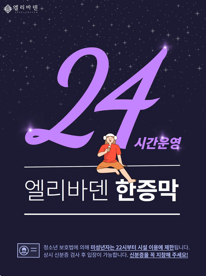 건강한 삶을 추구하는 도심 속 종합 휴양지! 다양한 놀이공간과 먹거리가 준비된 엘리바덴을 방문하세요. 300여종의 테마시설과 휴게공간 및 푸드코너 등 800평의 키즈카페가 준비되어 있어요. 특히, 물놀이장 같은 대형 볼풀장은 아이들에게 최고의 놀이시설이에요. 지친 일상에 휴식을 제공하는 사우나! 힐링스파로 온몸의 피로를 한번에 날려보세요. 친환경 해수 바데풀과 홍삼탕 및 안마탕 등 다양한 스파가 준비되어 있고 황토의 좋은 기운을 모은 황토방 수면 시설은 엘리바덴의 자랑이에요. 프리미엄 힐링 스파 엘리바덴에서 가족 및 연인과 함께 최고의 휴식을 즐기세요.