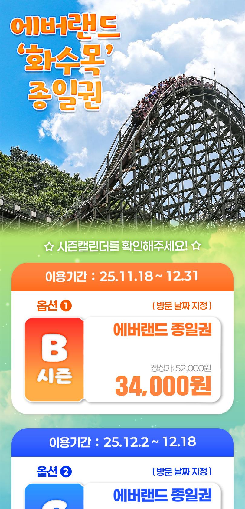 해당 티켓은 화, 수, 목 날짜지정형 티켓으로 보다 합리적인 가격에, 주말보다 여유롭게 에버랜드를 즐길 수 있어 더욱 좋아요. 티익스프레스, 허리케인 등 짜릿한 어트랙션부터, 레이싱코스터, 아마존 익스프레스 등 아이들과 함께 즐길 수 있는 어트랙션까지 모두 있어 가족 나들이로도 제격이에요. 시즌마다 바뀌는 에버랜드의 가든과 볼거리가 가득한 화려한 퍼레이드까지 모두 놓치지 마세요.