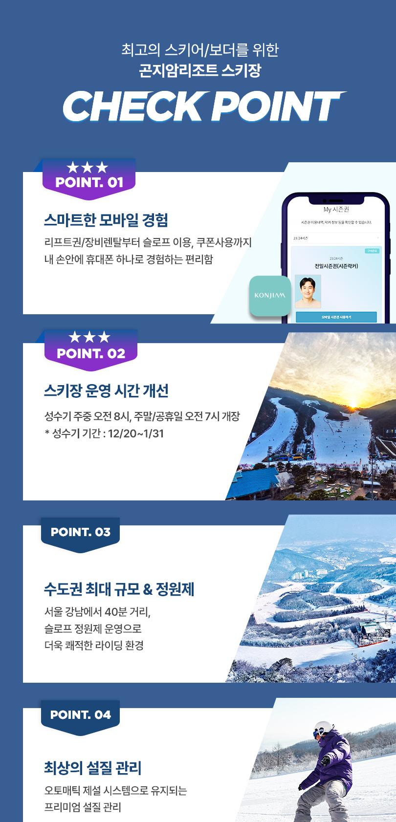 시즌권 고객들의 선호 시간대를 반영해 주말 스키장을 새벽과 야간 시간 확대 운영을 시작하였고, 슬로프에서 더 쾌적하게 즐길 수 있도록 초중급 파노라마 슬로프를 확대하고 슬로프 정원제를 강화했어요. 초급부터 상급까지 모든 스키어가 더 안전하고 재미있게 즐길 수 있도록 수도권에서 가장 길고 넓고 다양한 슬로프도 구성되어 있어요. 최고의 제설과 강습 전문가를 보유한 스키장으로 수준 높은 스키 강습과 최고의 설질로 맞이하는 곤지암리조트에요!