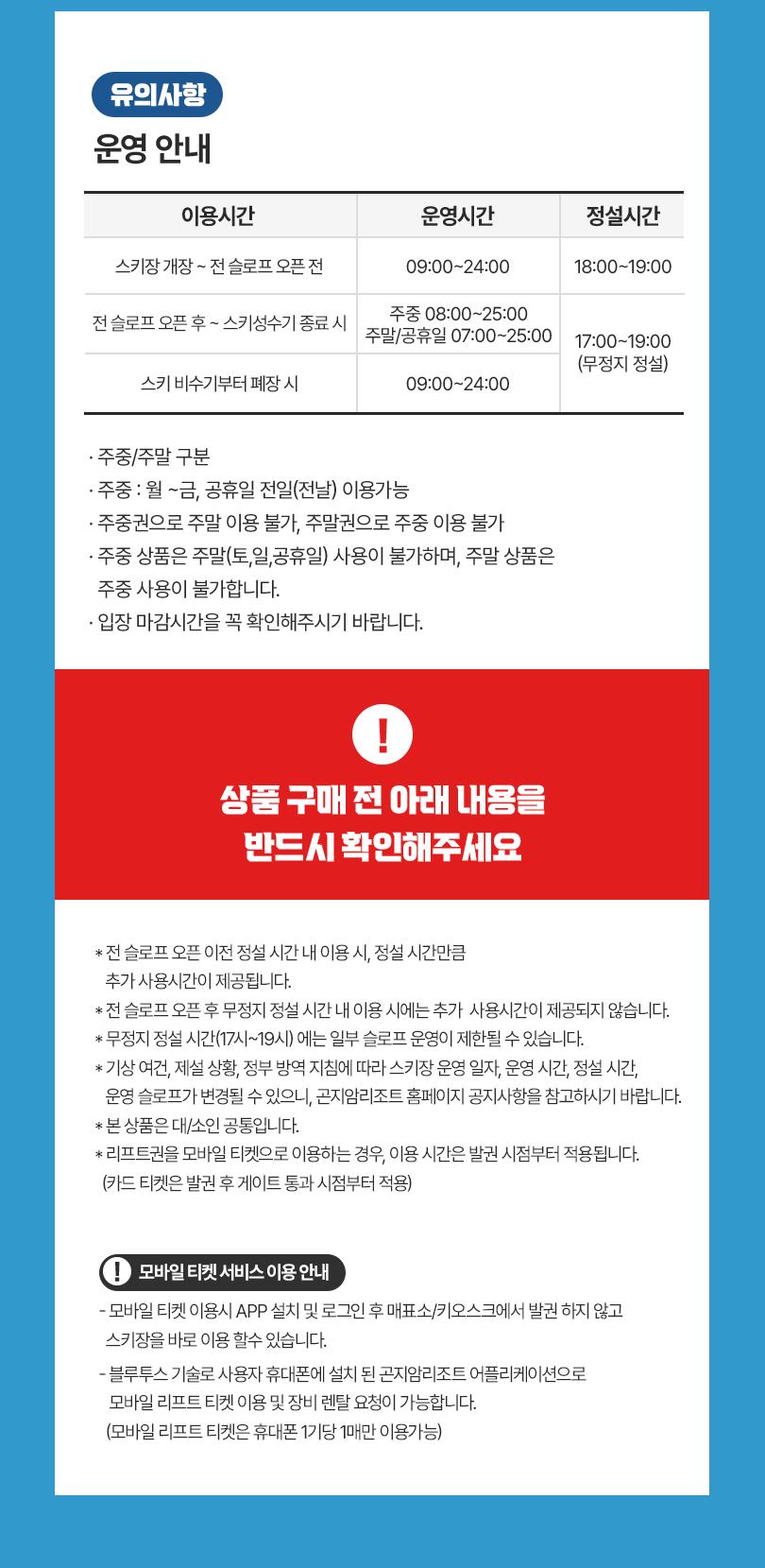 ※ 정확한 스키 슬로프 및 권종별 운영일정은 기상 여건, 제설 상황, 정부 방역지침에 따라 변경될 수 있으니, 곤지암리조트 홈페이지를 반드시 확인해주세요.