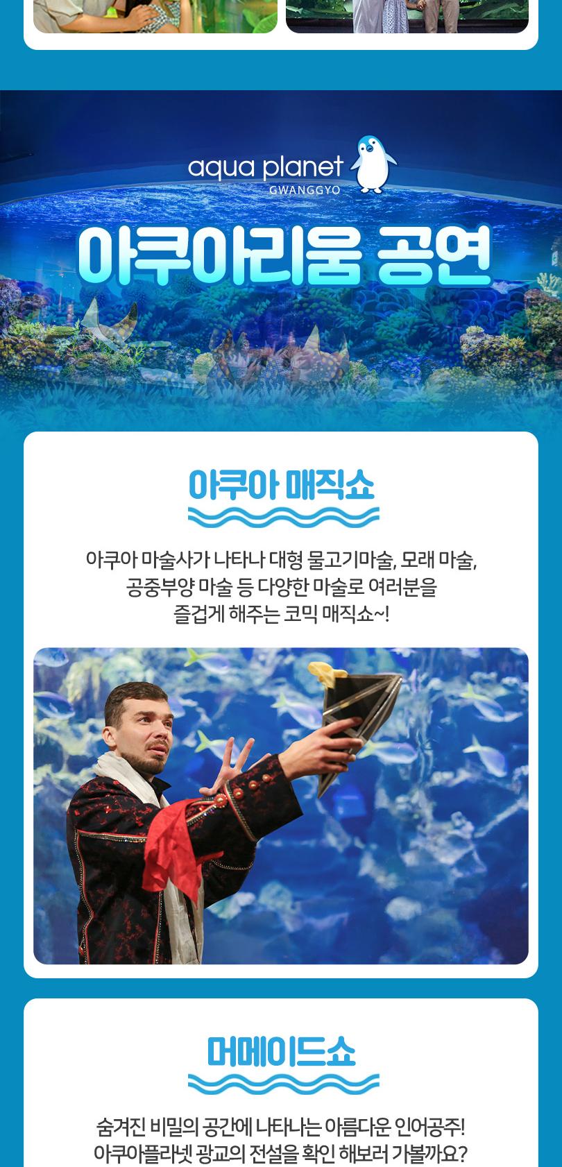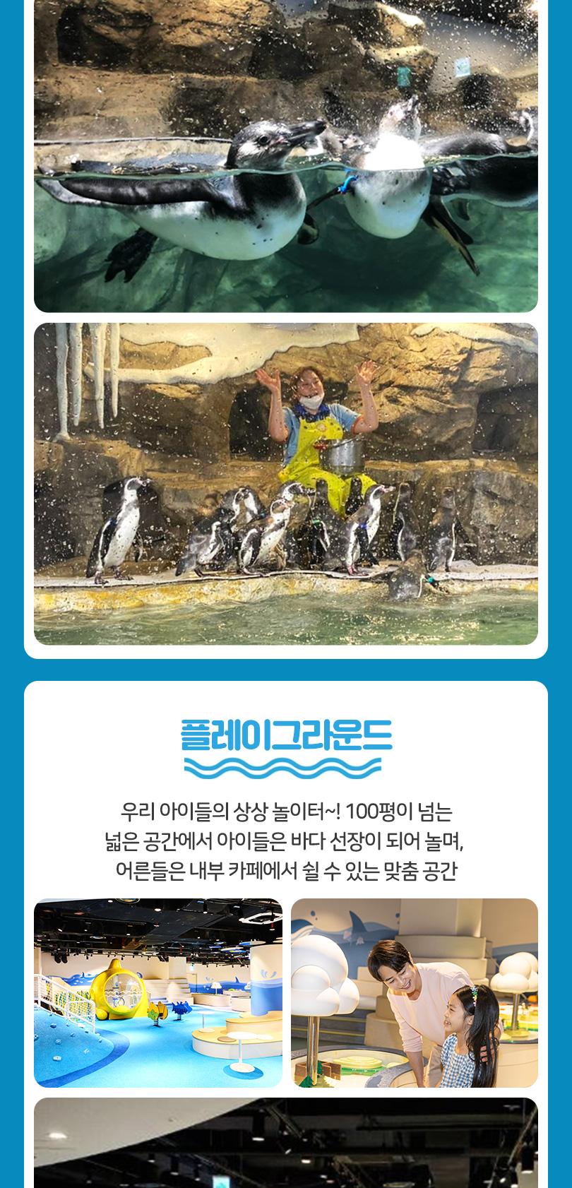 지금까지 경험해보지 못했던 Funny한 체험과 아름다운 바다 속 세상! 기존 아쿠아플라넷 보다 더욱 쾌적한 환경에서 여러 생물들을 만날 수 있어요. 내부에는 다양한 체험존과 여러가지 공연이 준비되어 있으니 알차게 즐겨보세요.