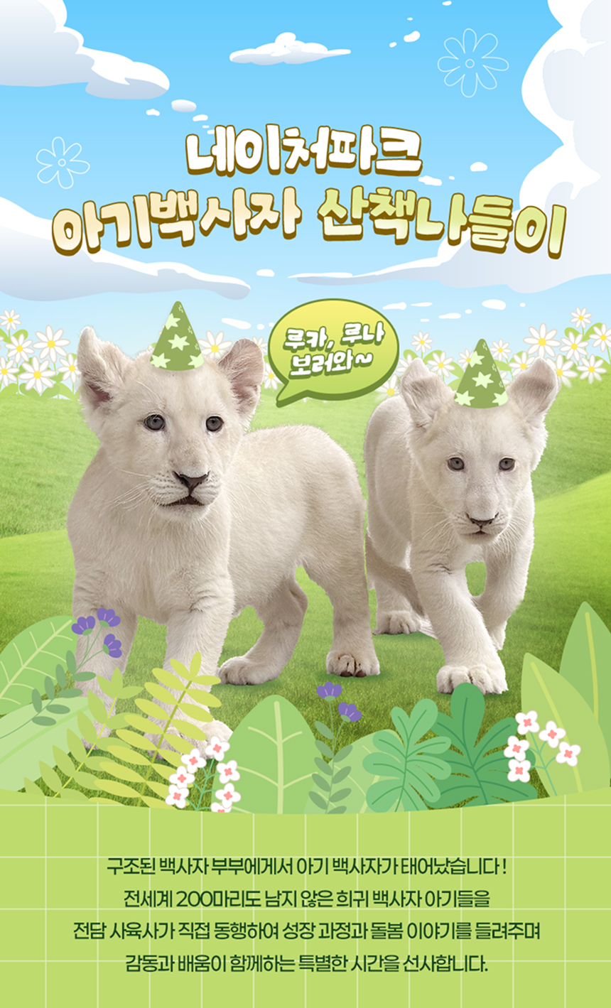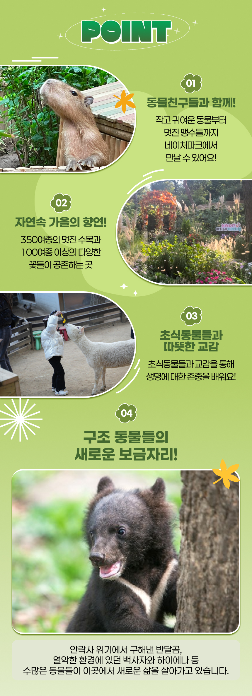 전국최초 교감형 생태 동물원, 대구 네이처파크에 놀러 오세요. 12만 평 부지의 식물원 해 초대형 글라스하우스 동물원과 방사형 야외 동물원으로 구성된 네이처파크는 50여 종, 300마리 이상의 동물, 350여 종의 수목, 100여 종 이상의 다양한 꽃들이 공존하는 곳이에요. 실내동물원과 야외의 버드가든, 다람쥐빌리지, 플라워가든, 플레이가든으로 이루어진 네이처파크에서 도심 속 자연의 아름다움을 느끼며 특별한 시간을 보내보세요.