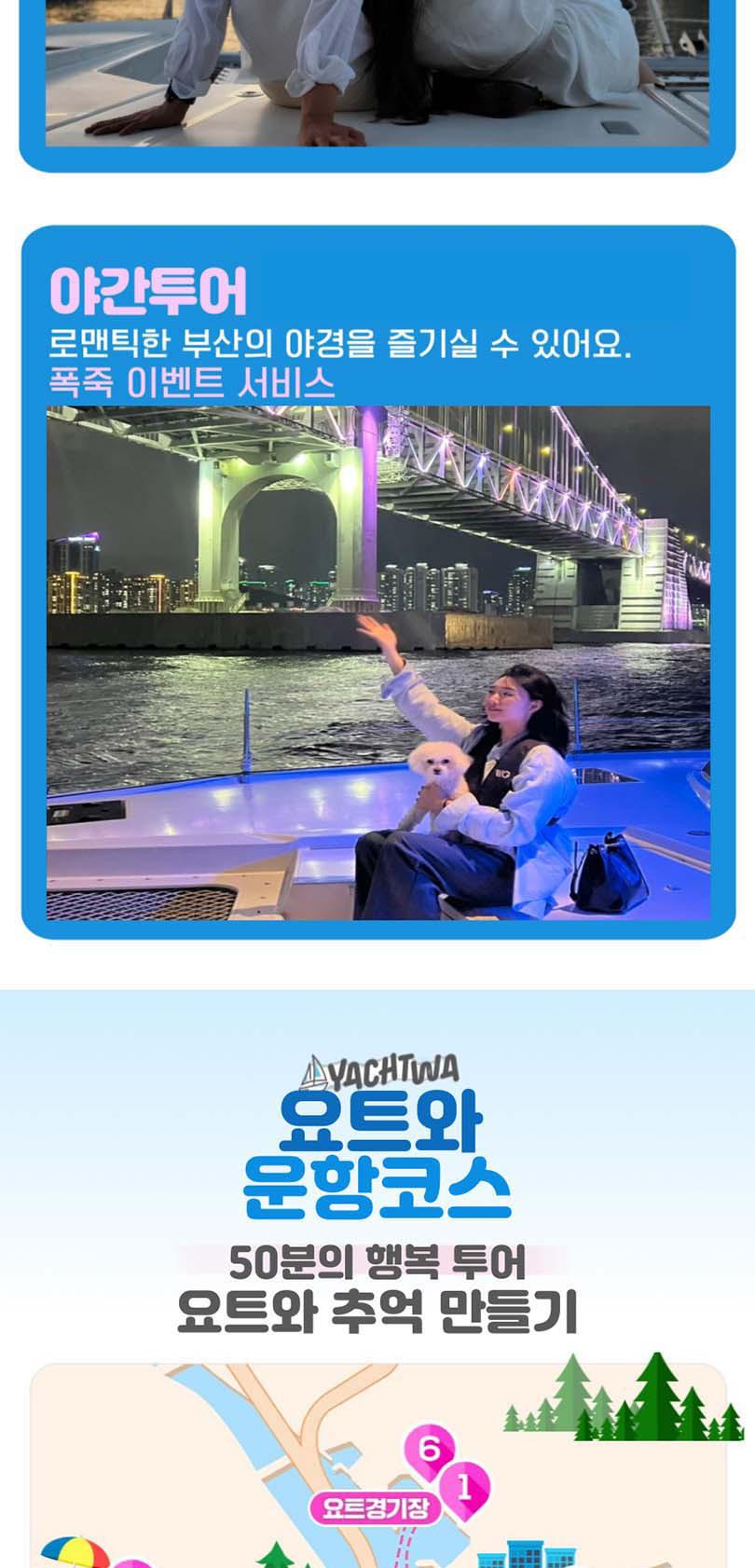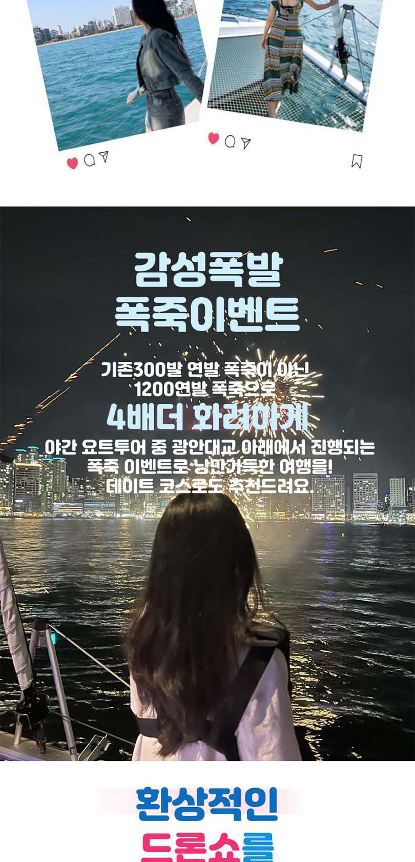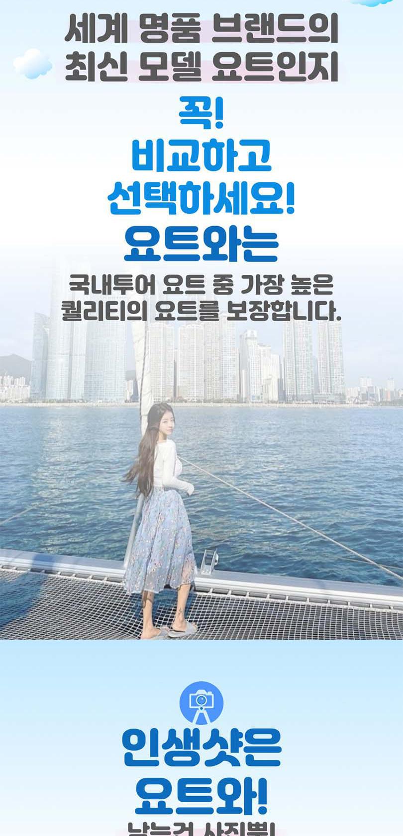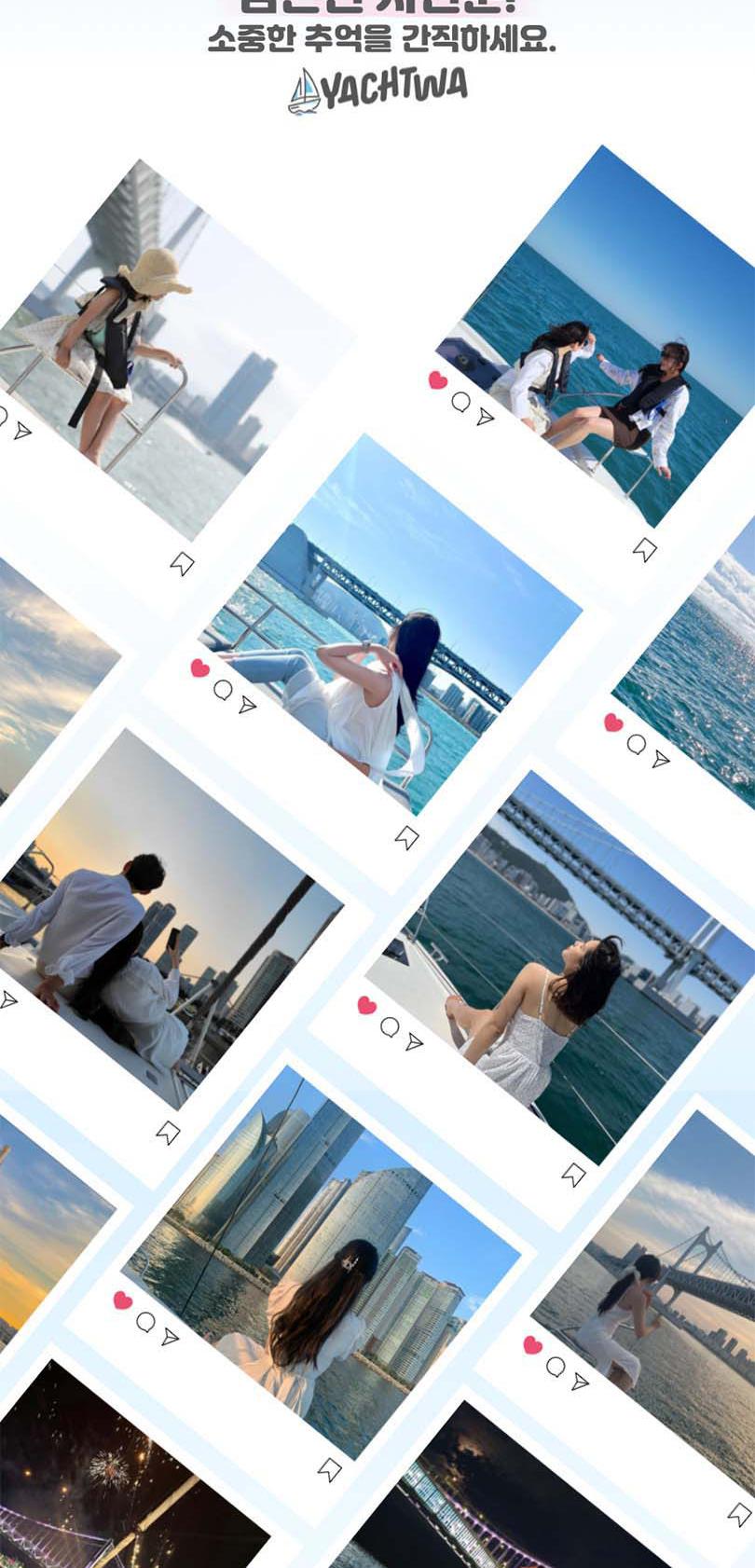 끝없는 바다 위의 특별한 시간, 요트와에서 만나보세요. 세계 명품 브랜드의 최신 모델 요트에서 50%의 승선 인원으로 쾌적하게 부산의 랜드마트들을 한 번에 볼 수 있어요. 주간에는 무료 폴라로이드 사진 이벤트, 야간에는 기존의 4배 규모의 화려한 불꽃놀이가 기다리고 있어 언제든 사진을 찍는 순간 인생샷 명소예요.