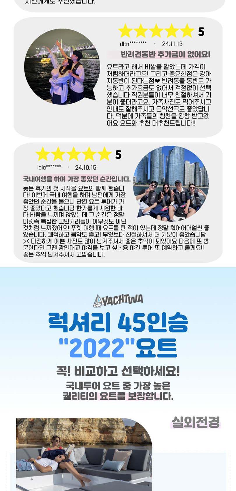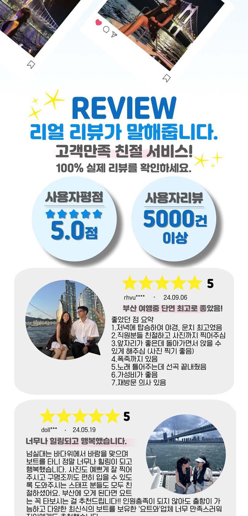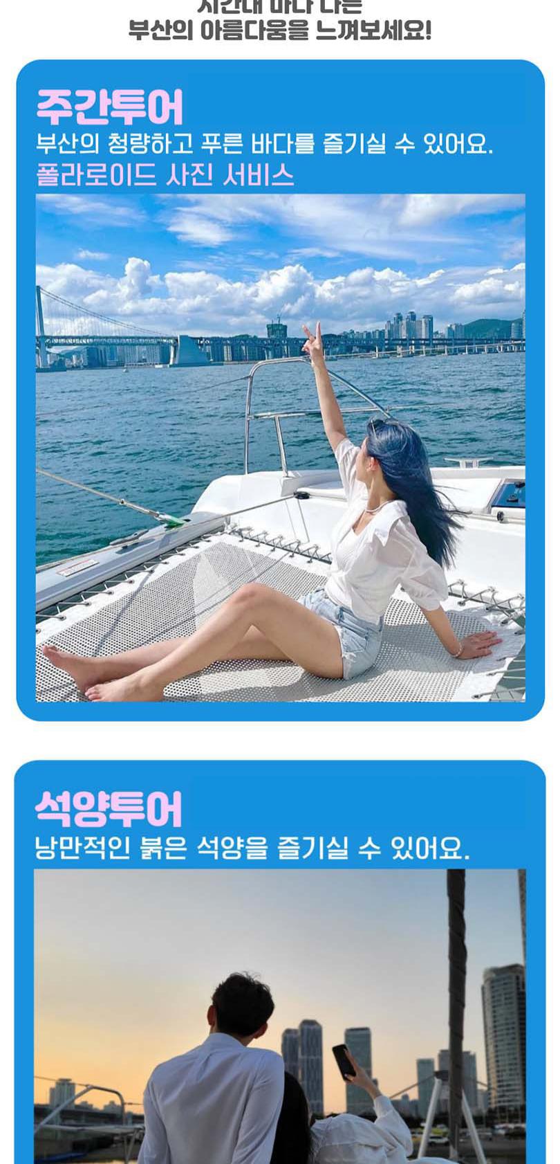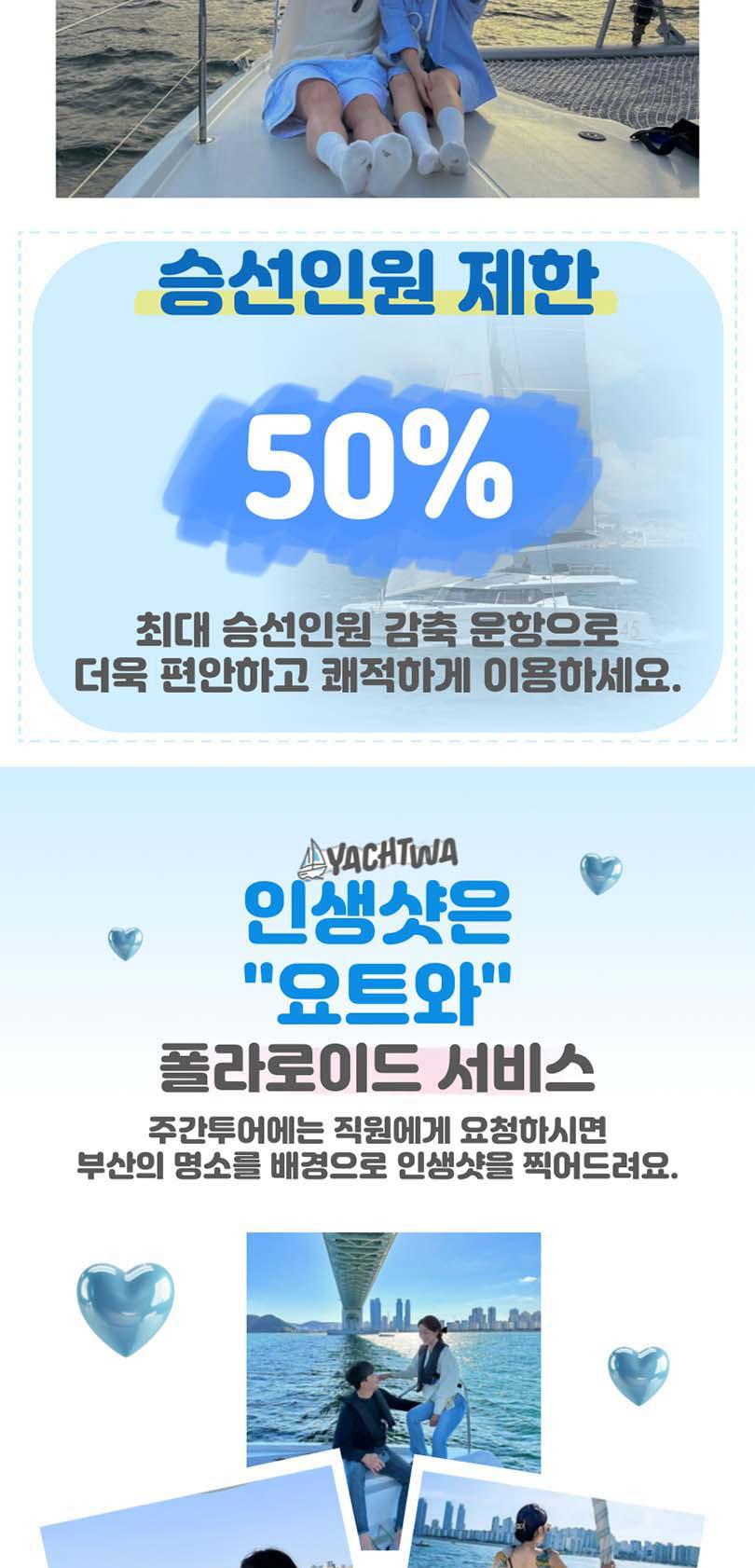 끝없는 바다 위의 특별한 시간, 요트와에서 만나보세요. 세계 명품 브랜드의 최신 모델 요트에서 50%의 승선 인원으로 쾌적하게 부산의 랜드마트들을 한 번에 볼 수 있어요. 주간에는 무료 폴라로이드 사진 이벤트, 야간에는 기존의 4배 규모의 화려한 불꽃놀이가 기다리고 있어 언제든 사진을 찍는 순간 인생샷 명소예요.