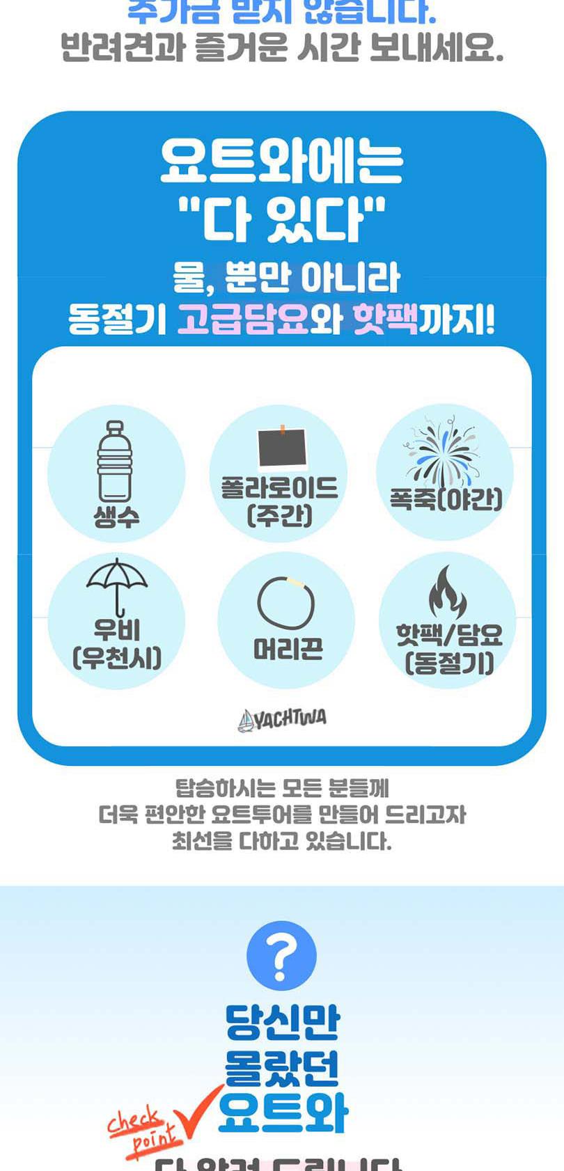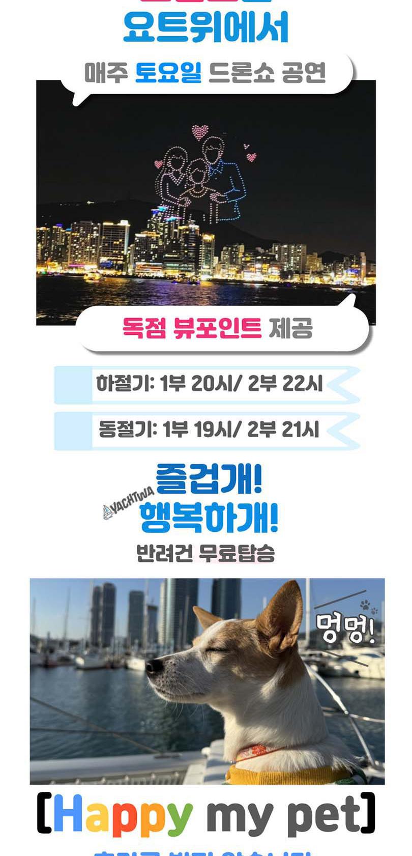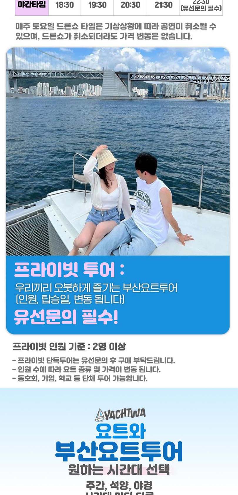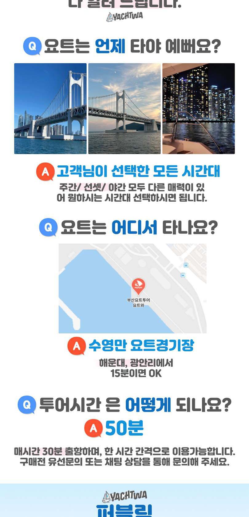 끝없는 바다 위의 특별한 시간, 요트와에서 만나보세요. 세계 명품 브랜드의 최신 모델 요트에서 50%의 승선 인원으로 쾌적하게 부산의 랜드마트들을 한 번에 볼 수 있어요. 주간에는 무료 폴라로이드 사진 이벤트, 야간에는 기존의 4배 규모의 화려한 불꽃놀이가 기다리고 있어 언제든 사진을 찍는 순간 인생샷 명소예요.