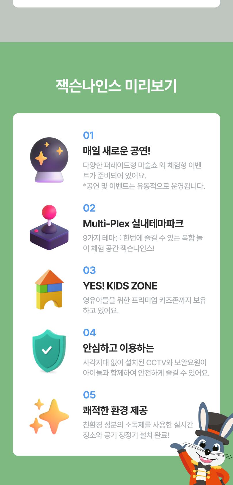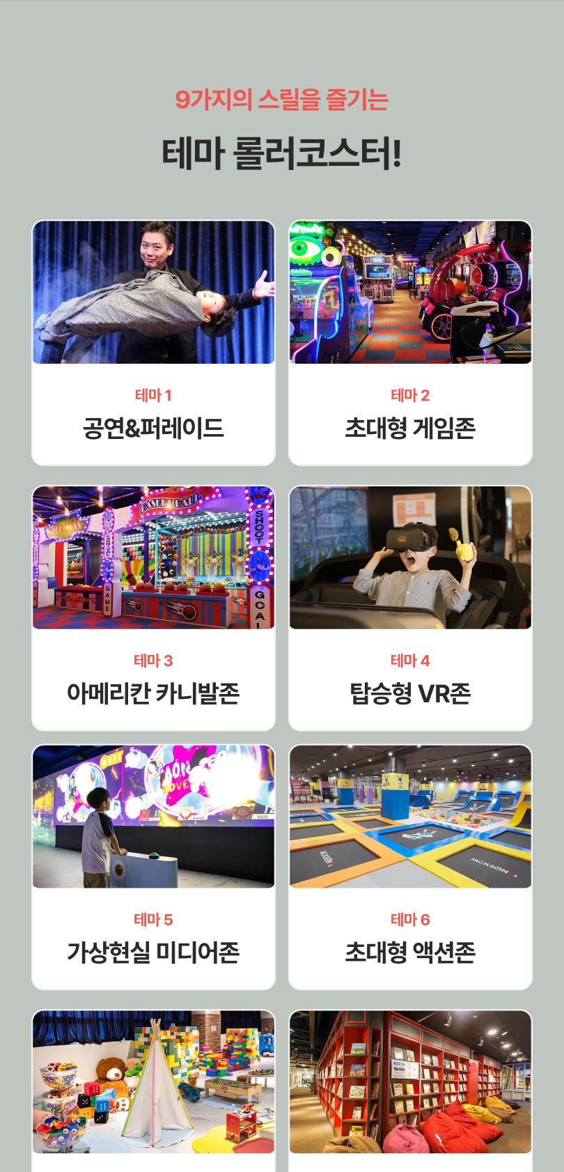 한 공간에서 무려 9가지 테마를 모두 즐길 수 있는 복합 놀이 체험 공간으로, 아이들의 호기심과 상상력을 한껏 자극해요. 영유아를 위한 프리미엄 키즈존도 따로 마련되어 있어 연령대에 맞춘 안전한 놀이가 가능해요 👶💛 안전도 걱정 없어요! 사각지대 없이 설치된 CCTV와 상시 대기 중인 보안요원이 아이들과 함께해 안심하고 즐길 수 있고, 친환경 성분의 소독제를 활용한 실시간 청소 시스템과 공기청정기 설치 완료로 쾌적한 환경까지 완벽하게 갖췄어요 🌿✨