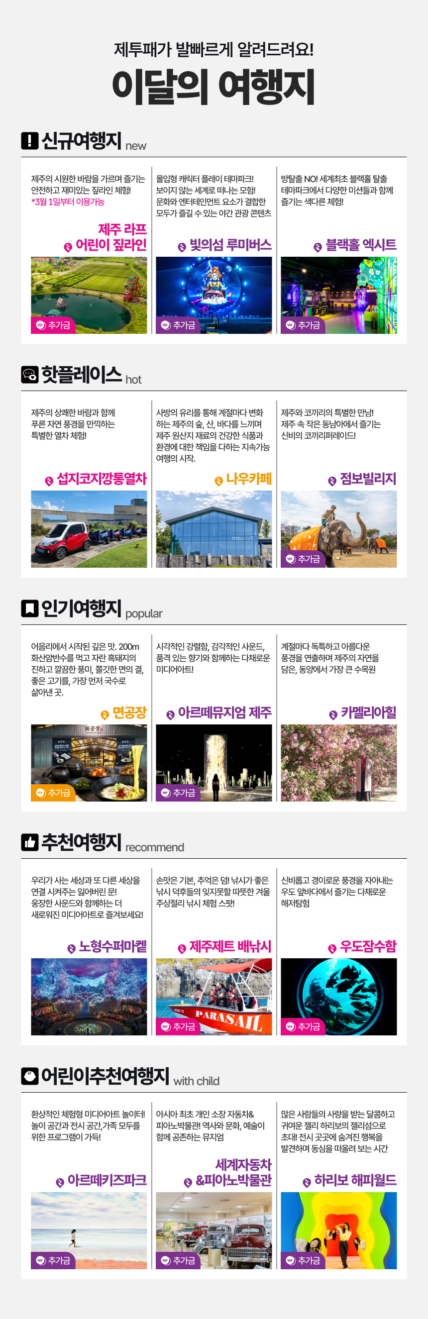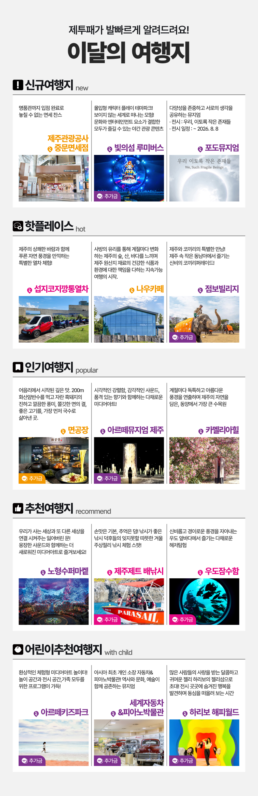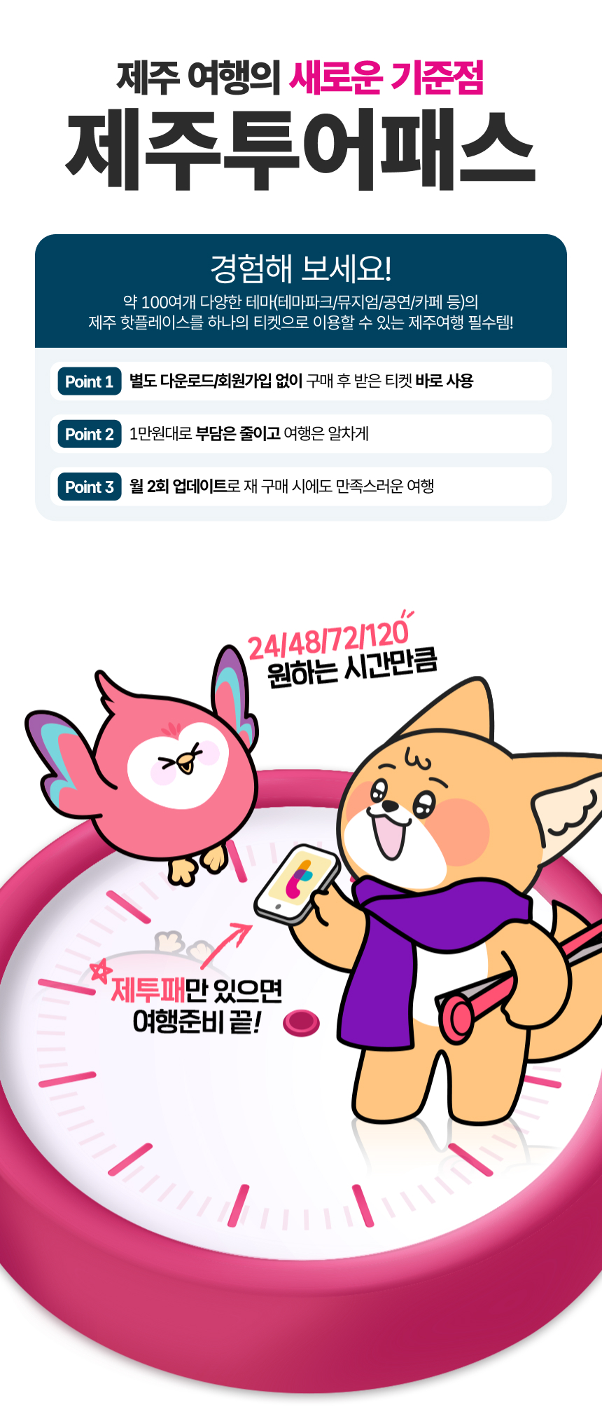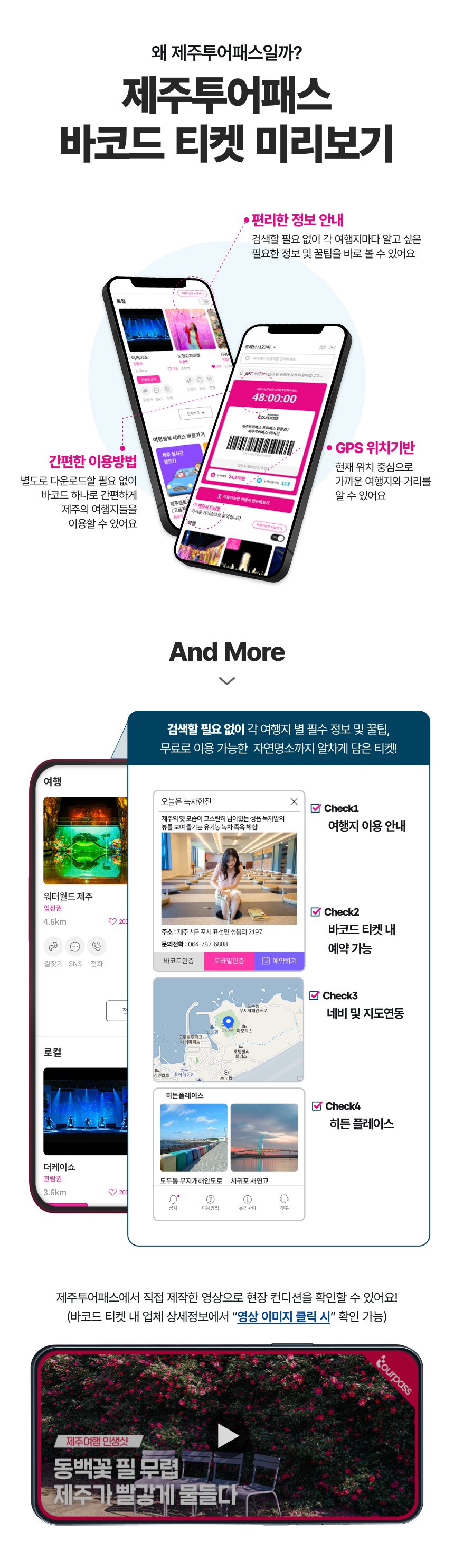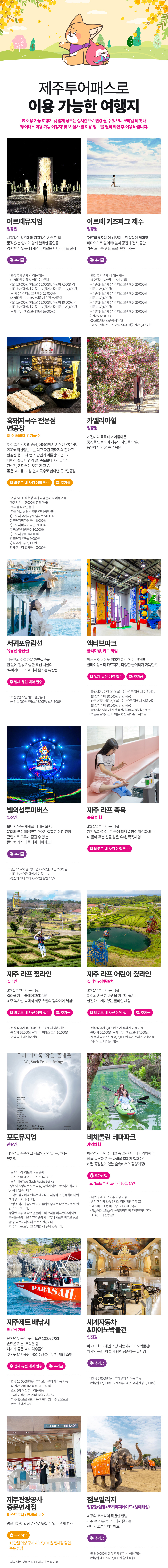 갈 곳은 많고 사야하는 입장권이 많을때! 48시간 프리 제주투어패스를 이용해보세요. 역대급 제주도 상품으로 필수로 챙겨야할 모든 명소를 포함한 티켓이에요. 이용 가능 여행지는 실시간으로 변경 될 수 있으니 모바일 티켓의 '투어패스 이용가능 여행지'만 확인하면 어디든 무료 입장할 수 있어요!
