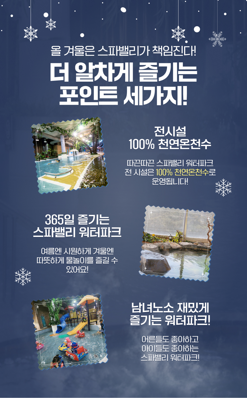 스파밸리를 더 알차게 즐기는 핵심 포인트 3가지! 첫번째는 따끈따끈한 스파밸리 워터파크 전 시설은 100% 천연 온천수로 운영돼요. 겨울에도 몸을 포근하게 감싸주는 온천수로 물놀이와 힐링을 동시에 즐길 수 있어요. 두번째는 여름엔 시원하게, 겨울엔 따뜻하게! 사계절 내내 계절에 맞게 즐길 수 있는 워터파크로, 언제 방문해도 만족스러운 시간을 보낼 수 있어요.세번째는 어른들도 좋아하고, 아이들도 좋아하는 스파밸리! 둥실둥실 떠다니는 유수풀부터 후끈후끈 힐링의 끝판왕 노천 오행탕과 대노천탕까지, 온 가족이 함께 즐길 수 있는 다양한 시설이 가득해요.