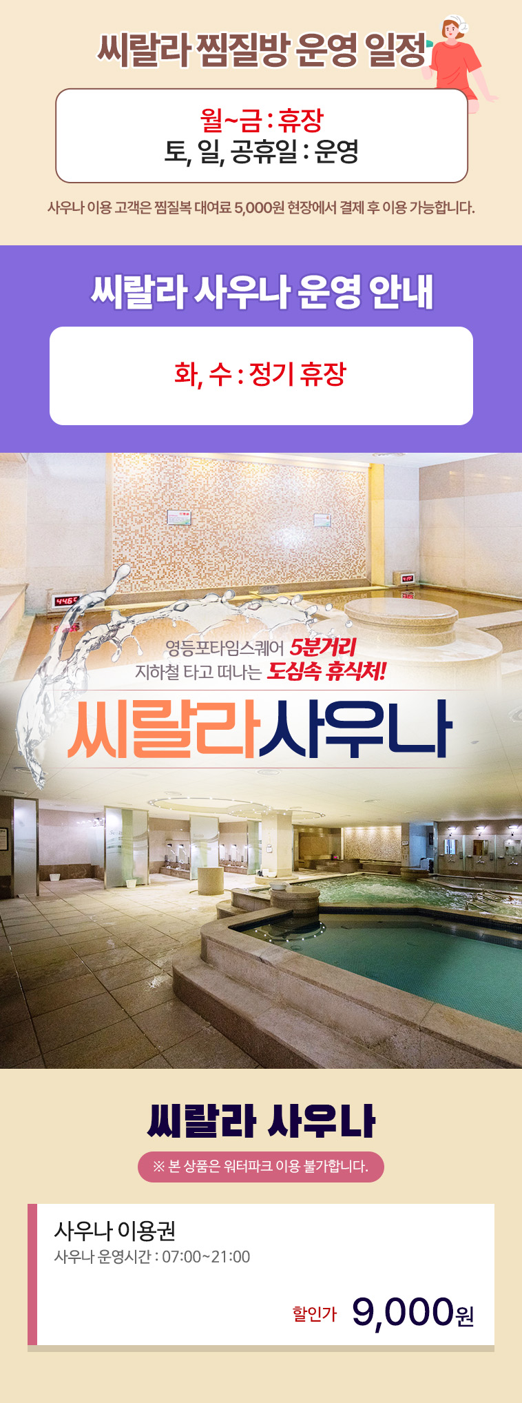 찜질방 : 매주 월~금 정기휴장 / 토,일,공휴일 정상 운영