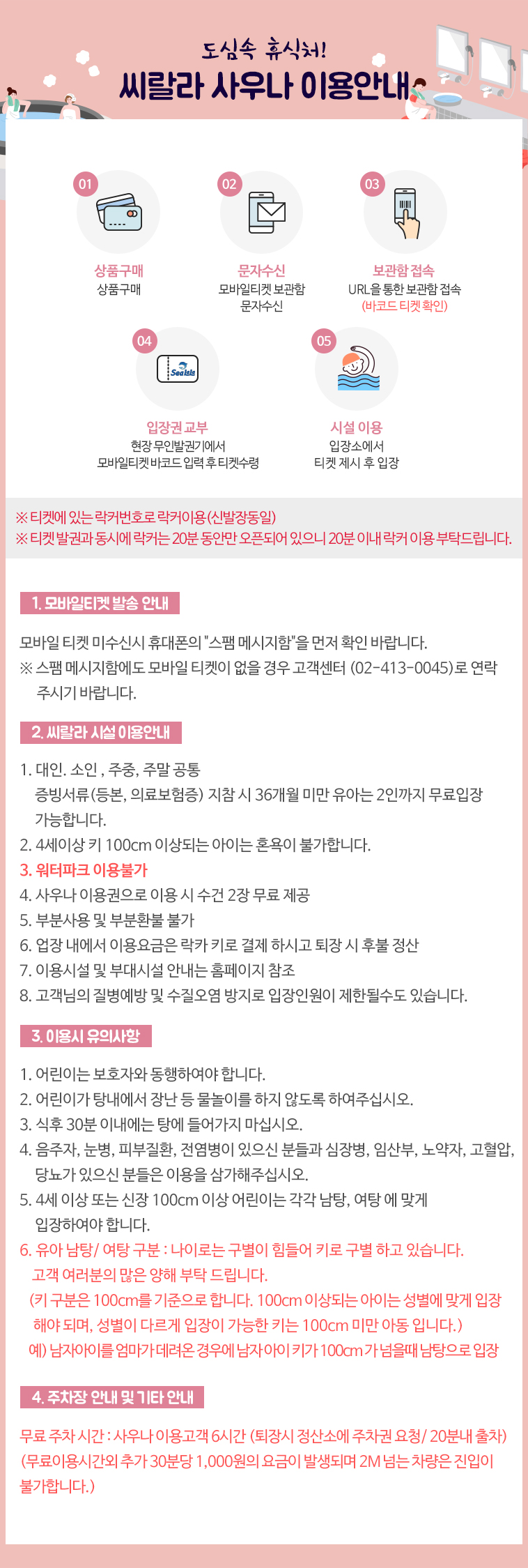 무료 주차 시간 : 사우나 이용고객 6시간 (퇴장시 정산소에 주차권 요청 / 20분내 출차)