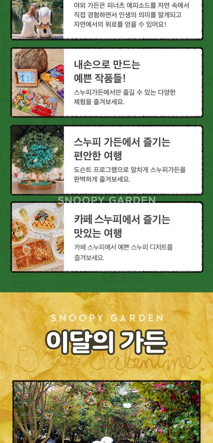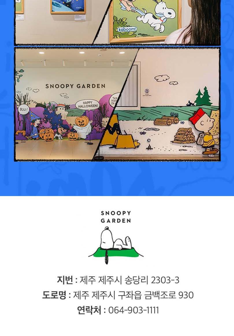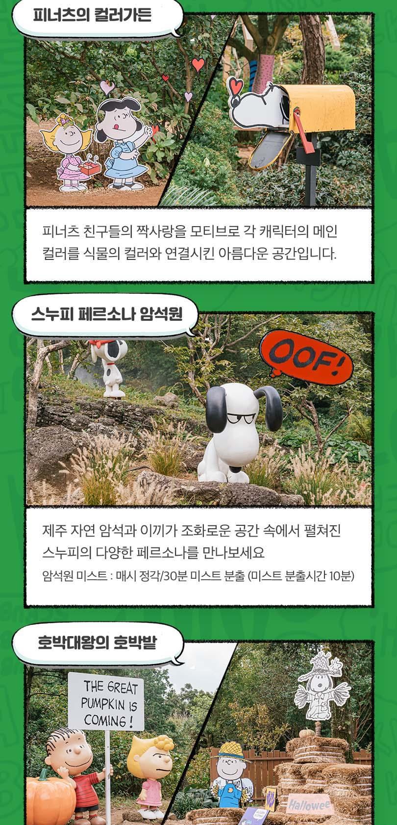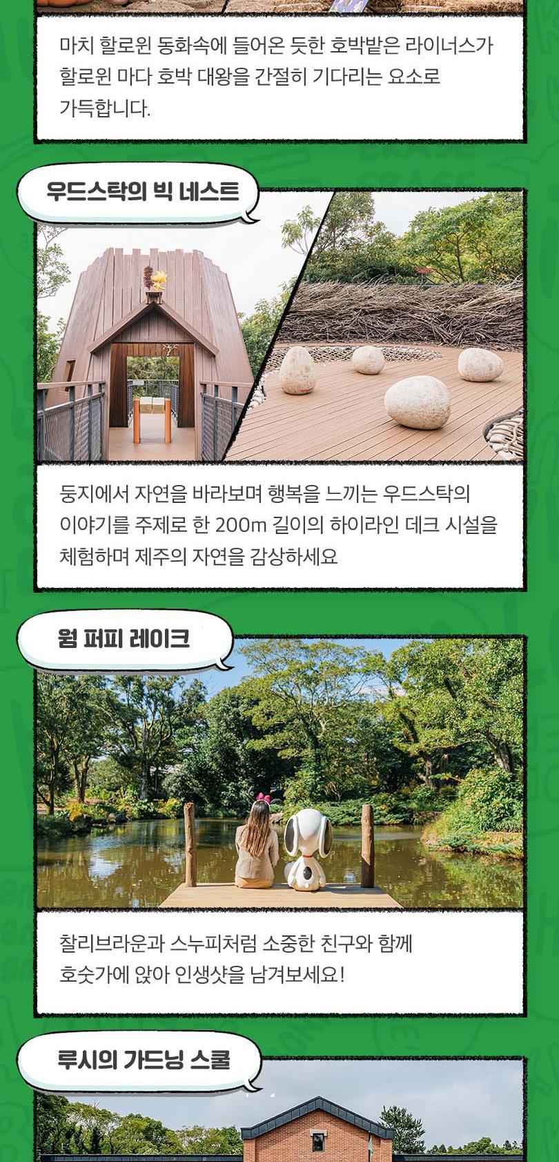 제주의 맑은 자연은 순수한 마음을 가진 피너츠의 캐릭터와 어우러져 방문하는 사람들에게 힐링을 전해요. 실내외, 피너츠 테마로 꾸며진 공간에서 귀여운 캐릭터들과 함께 사진을 남겨 보세요. 포토존을 찾아 산책하는 동안 스누피가든이 주는 평온함을 느끼실 수 있을 거예요.