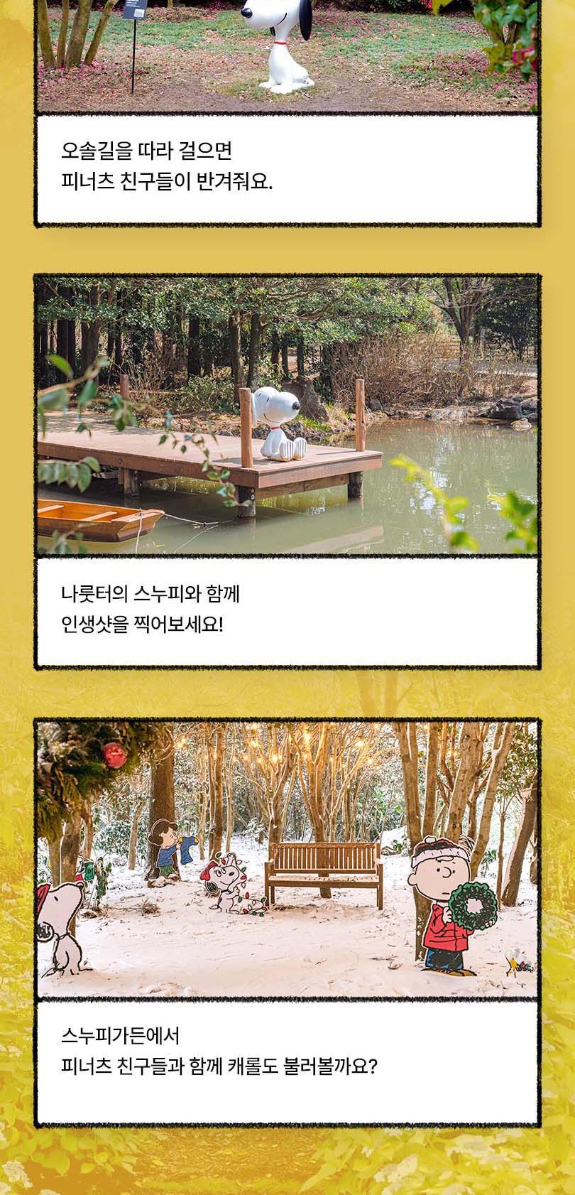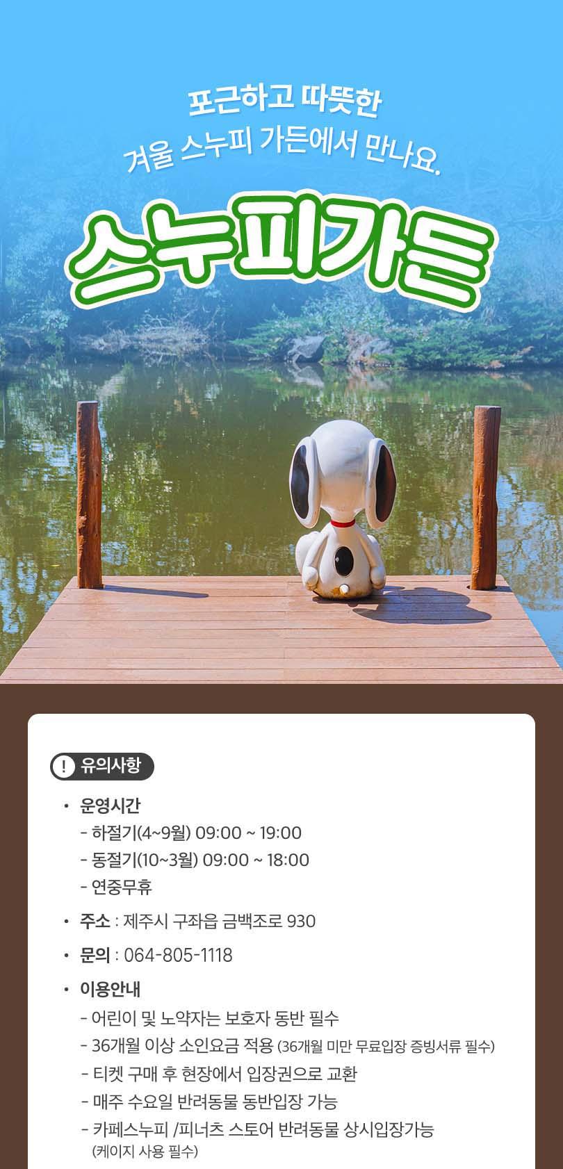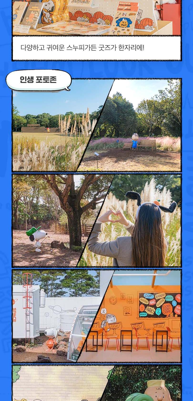 제주의 맑은 자연은 순수한 마음을 가진 피너츠의 캐릭터와 어우러져 방문하는 사람들에게 힐링을 전해요. 실내외, 피너츠 테마로 꾸며진 공간에서 귀여운 캐릭터들과 함께 사진을 남겨 보세요. 포토존을 찾아 산책하는 동안 스누피가든이 주는 평온함을 느끼실 수 있을 거예요.