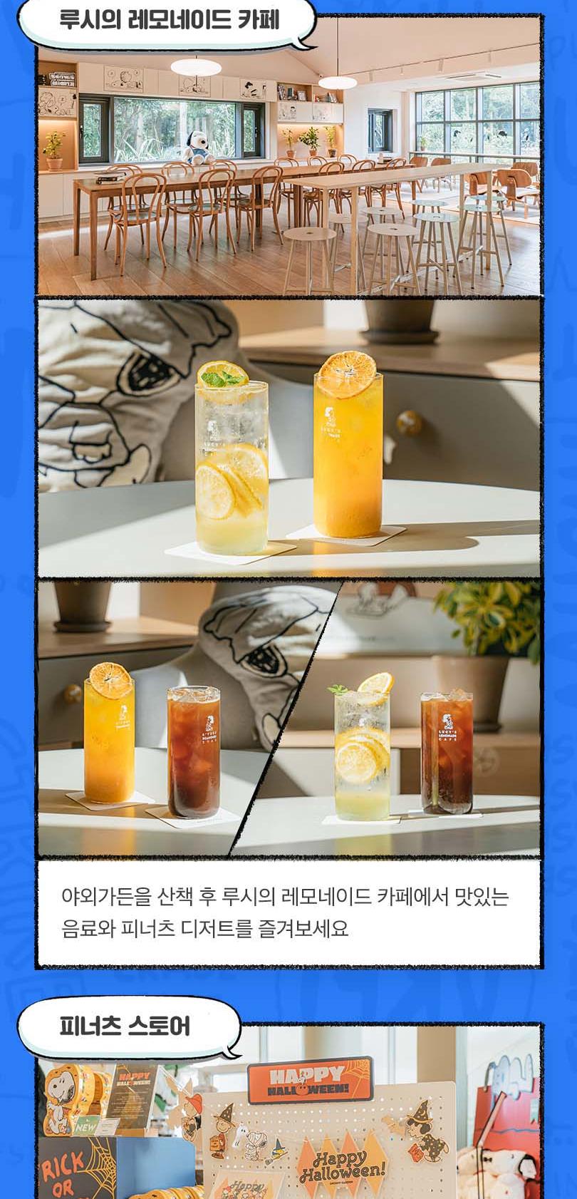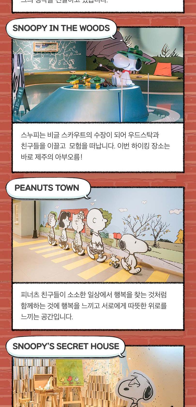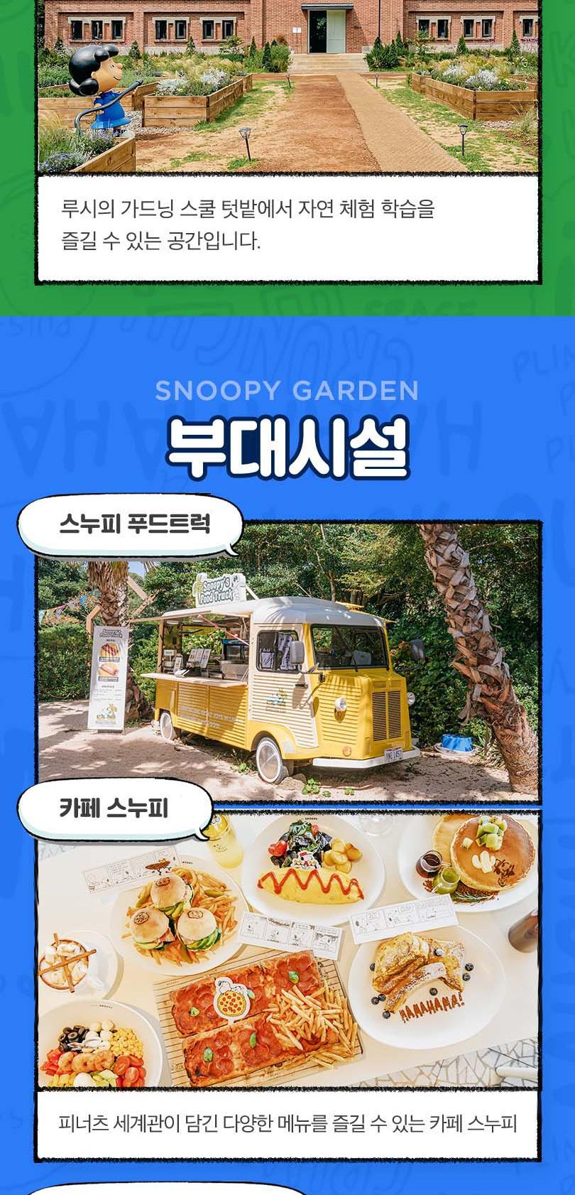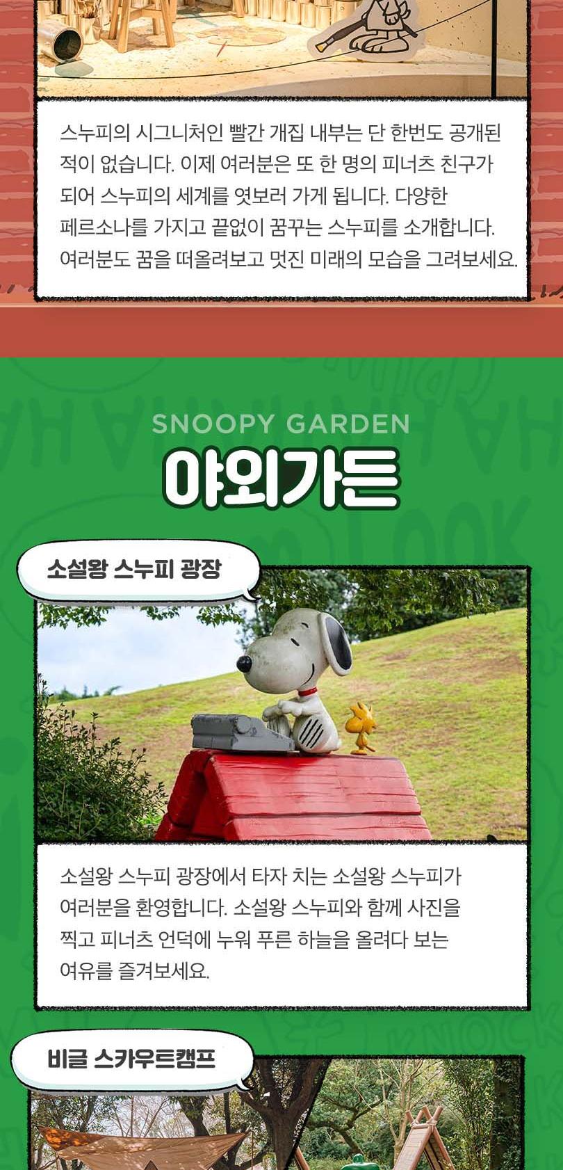 제주의 맑은 자연은 순수한 마음을 가진 피너츠의 캐릭터와 어우러져 방문하는 사람들에게 힐링을 전해요. 실내외, 피너츠 테마로 꾸며진 공간에서 귀여운 캐릭터들과 함께 사진을 남겨 보세요. 포토존을 찾아 산책하는 동안 스누피가든이 주는 평온함을 느끼실 수 있을 거예요.
