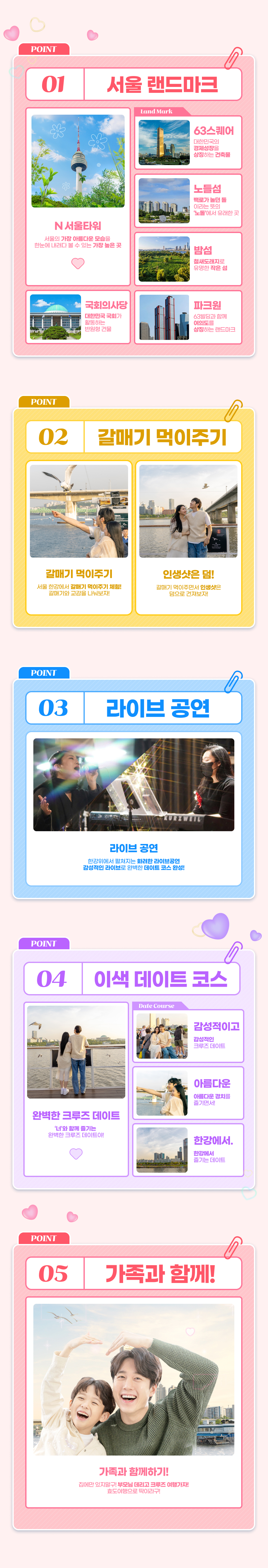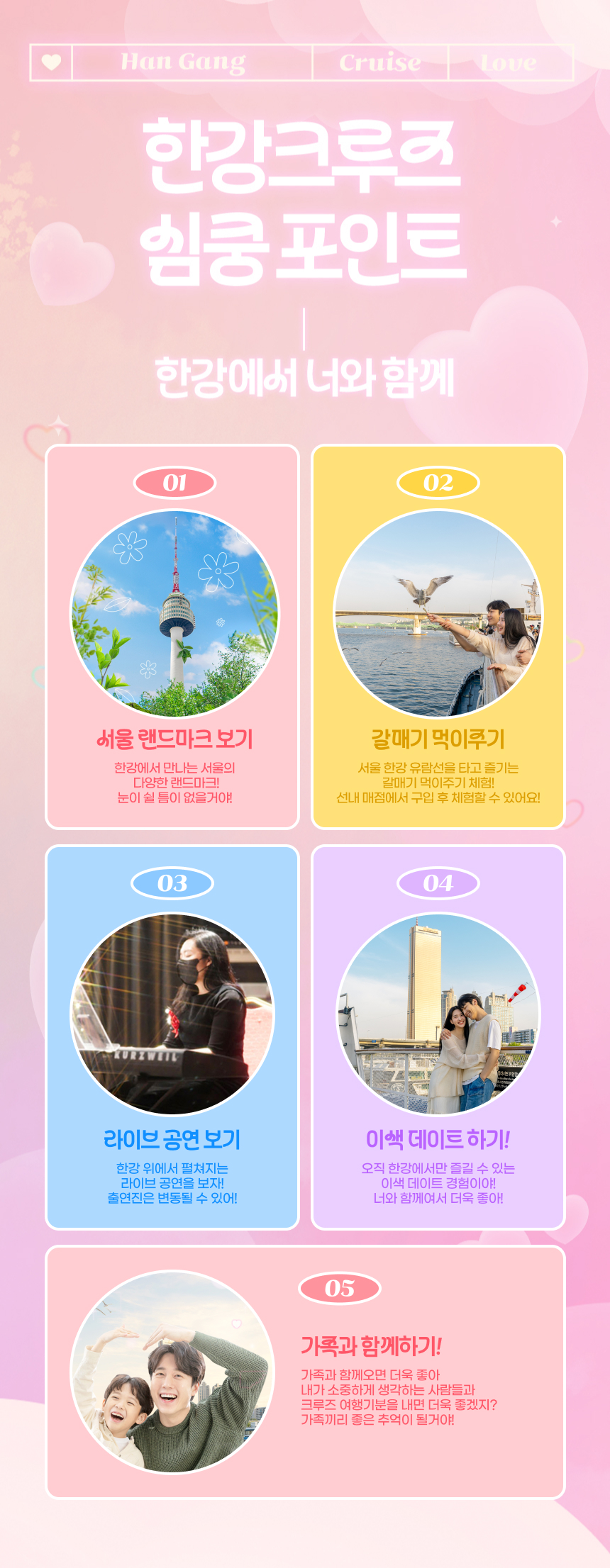 '문화와 관광이 어우러진 도심 속 복합 테마파크' 강의 푸른 건강함과 자연의 편안함을 느낄 수 있는 즐거운 곳. 한강에서 이랜드 크루즈와 함께 특별한 추억을 만들어 보세요. 붉게 물들어가는 노을을 볼 수 있는 선셋 크루즈부터 한강의 아름다운 야경을 보며 라이브 공연을 들을 수 있는 달빛 뮤직 크루즈까지 각기 다른 매력을 지는 4가지의 크루즈 상품이 있어요. 4가지 매력의 크루즈 상품 중 원하는 한강의 모습을 선택하여 낭만이 넘치는 서울의 랜드마크를 감상해 보세요. 한강 다리를 지나는 순간 남길 수 있는 인생샷도 놓치지 마세요!