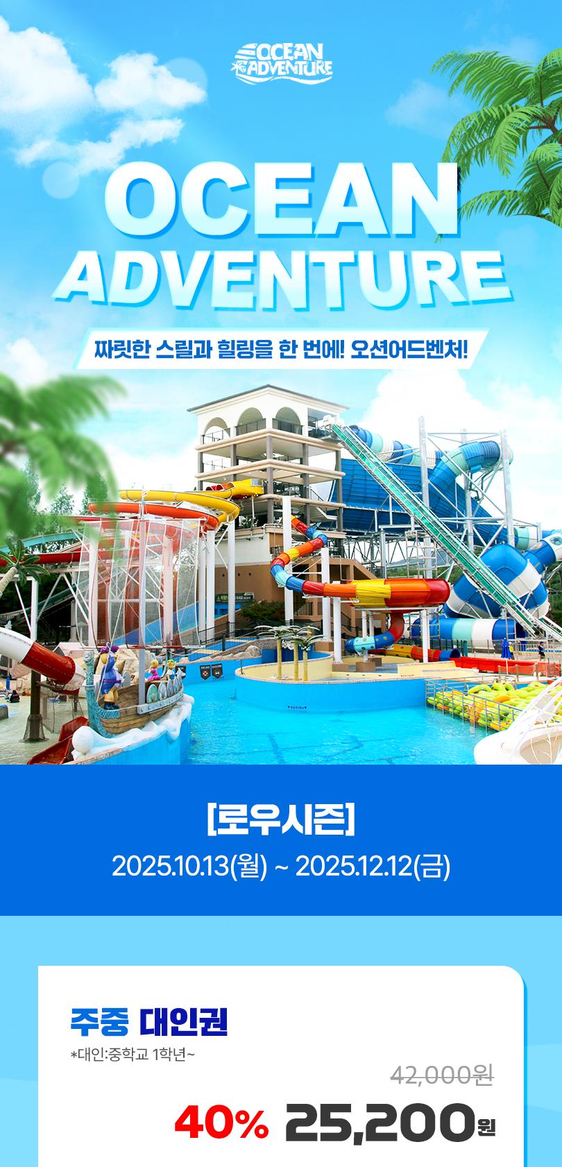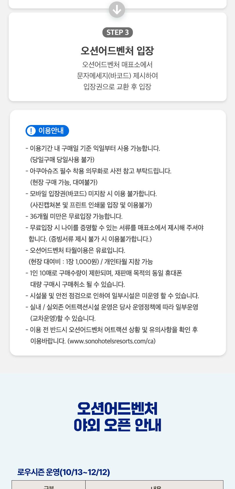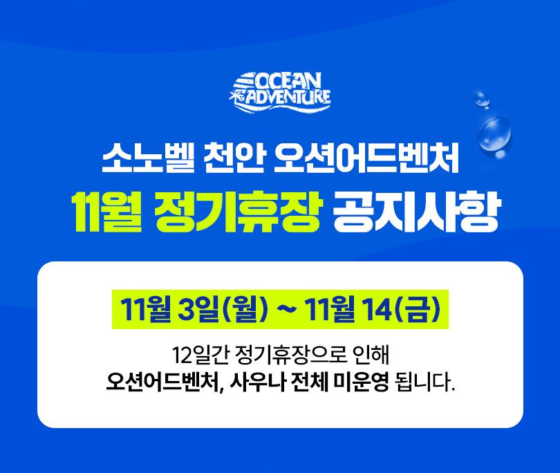 ※ 11월 3일(월) ~ 11월 14일(금) 12일간 정기 휴장으로 오션어드벤처, 사우나 전체 미운영으로 이용시 참고 부탁드립니다.